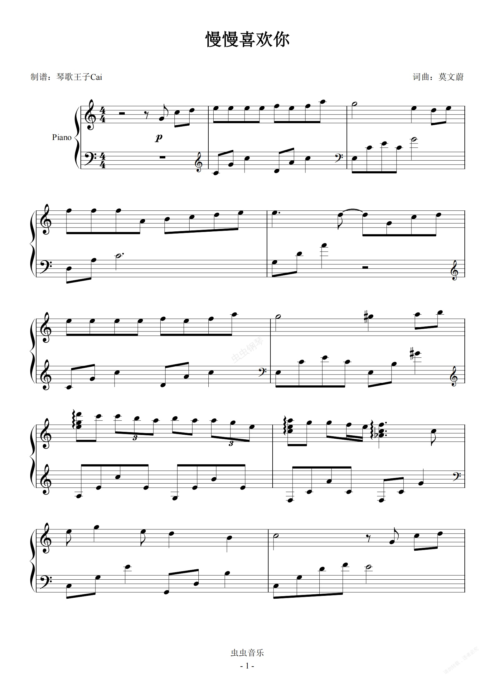 钢琴谱:慢慢喜欢你(琴歌王子Cai钢琴版) C调
