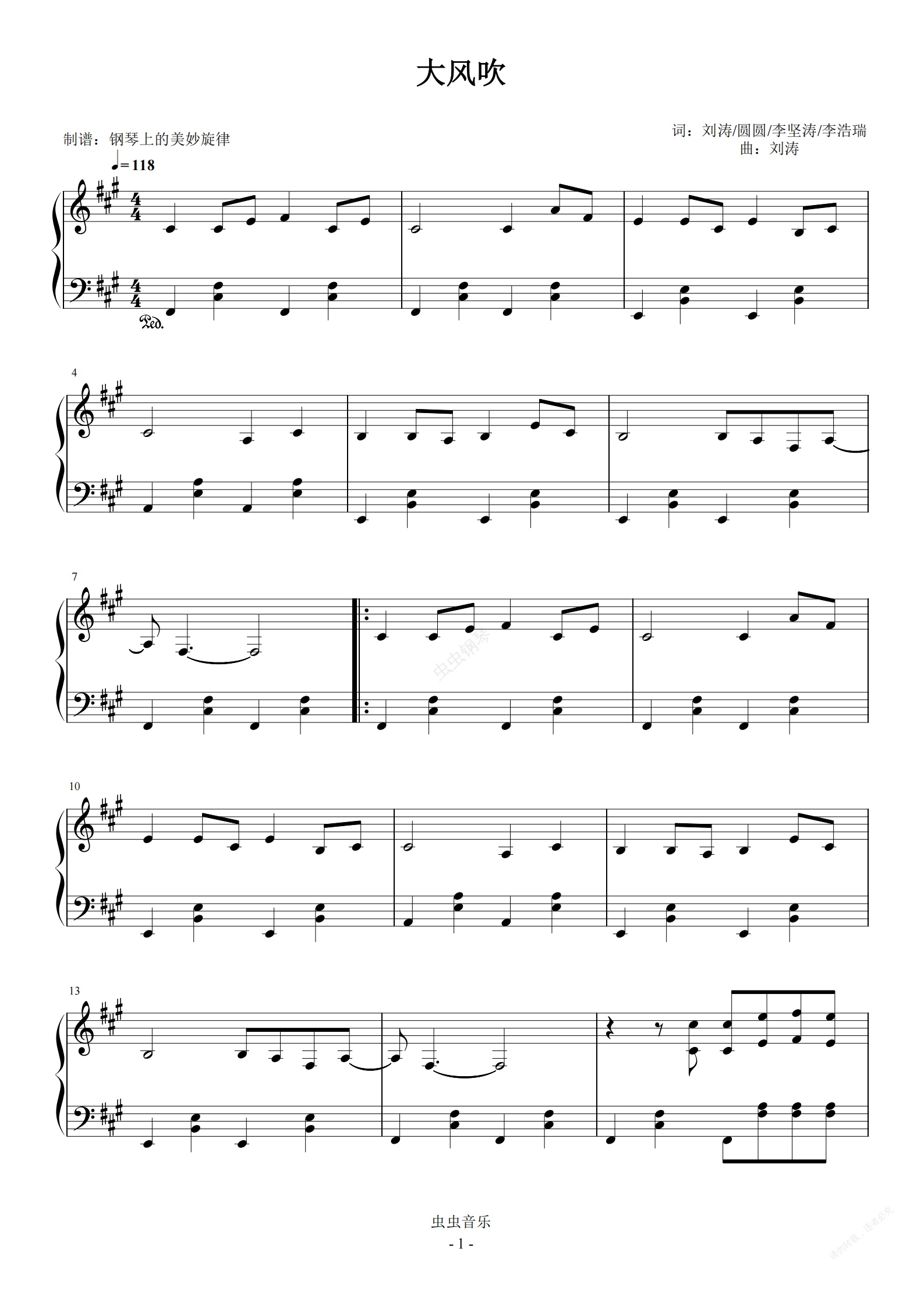钢琴谱:大风吹 简易版 抖音热曲