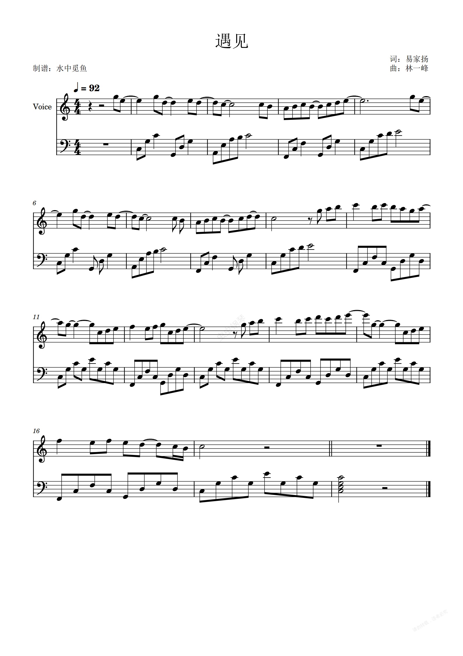 钢琴谱:遇见c调最完美简单独奏