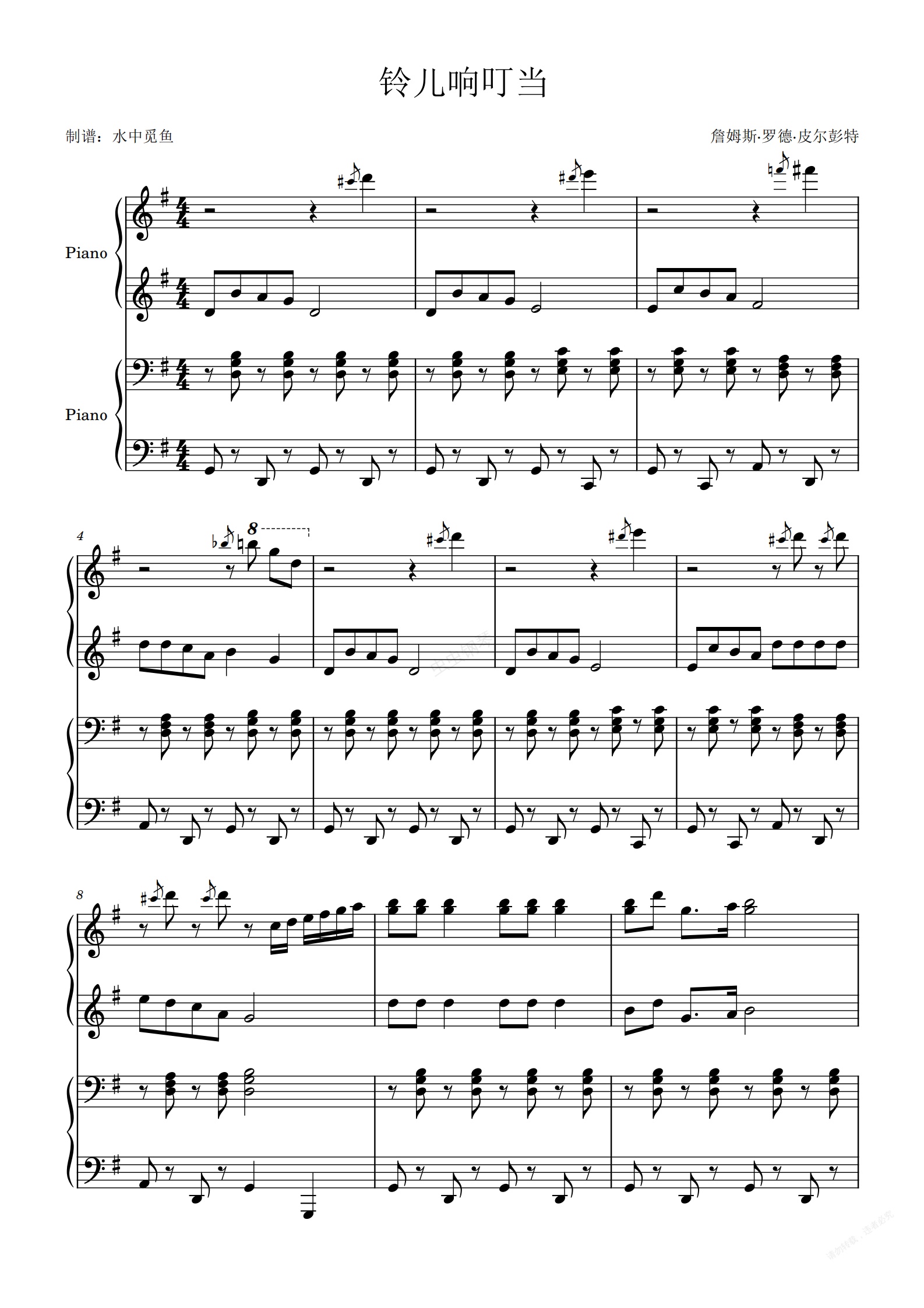 钢琴谱:铃儿响叮当g调最完美四手联弹