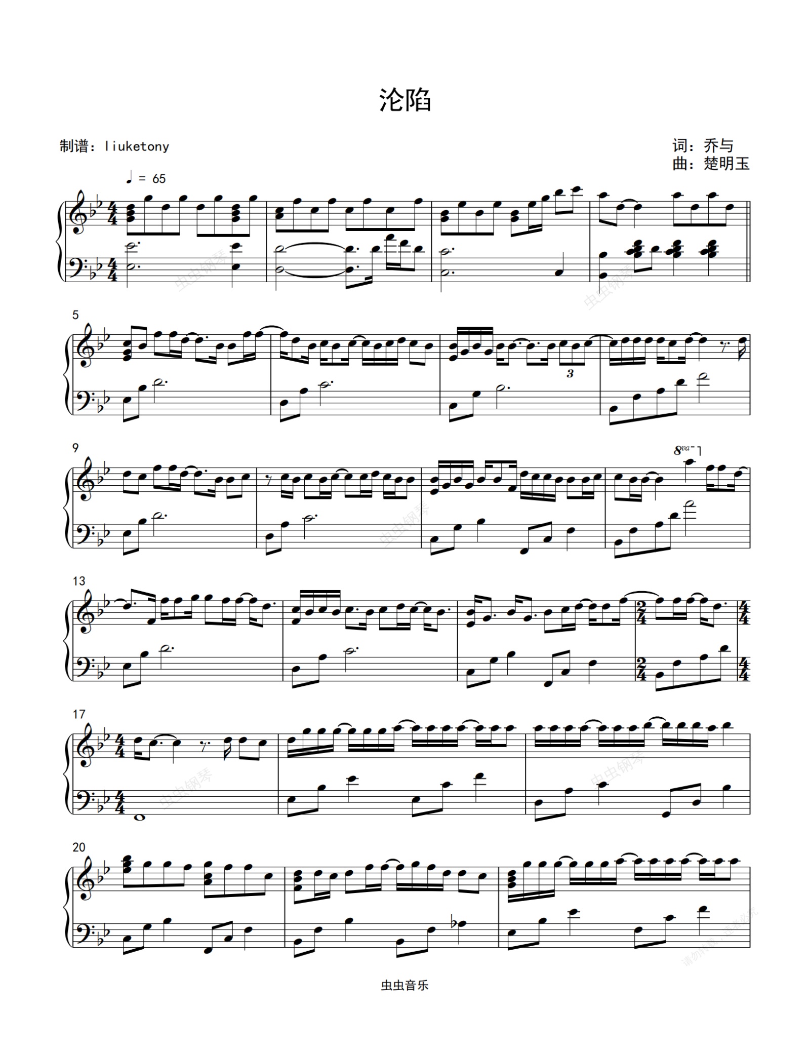 钢琴谱:沦陷 - 钢琴独奏原调