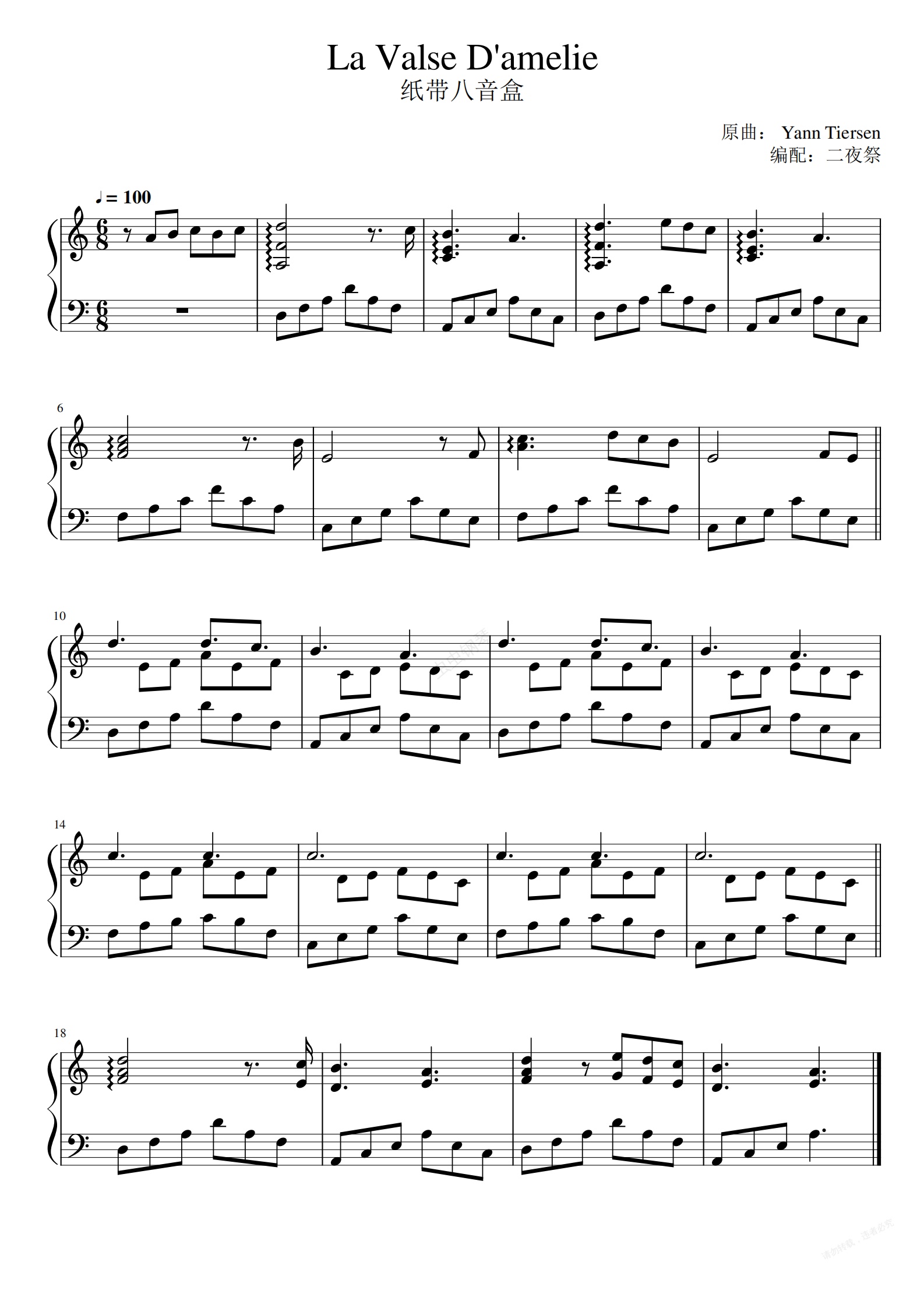 钢琴谱:【天使爱美丽】La Valse D'Amélie【纸带八音盒】