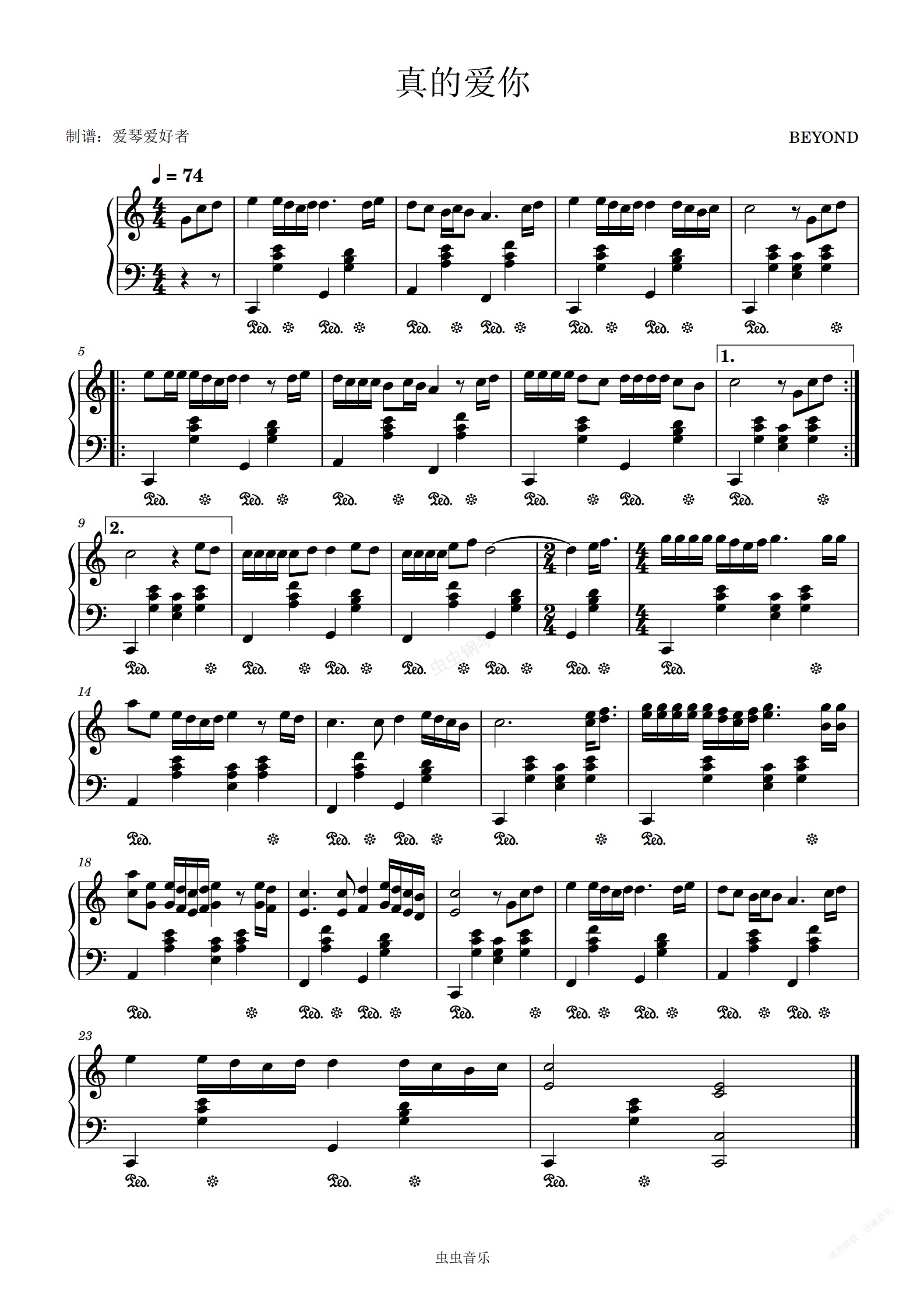 钢琴谱:Beyond《真的爱你》C大调简易版,左手和弦伴奏模式