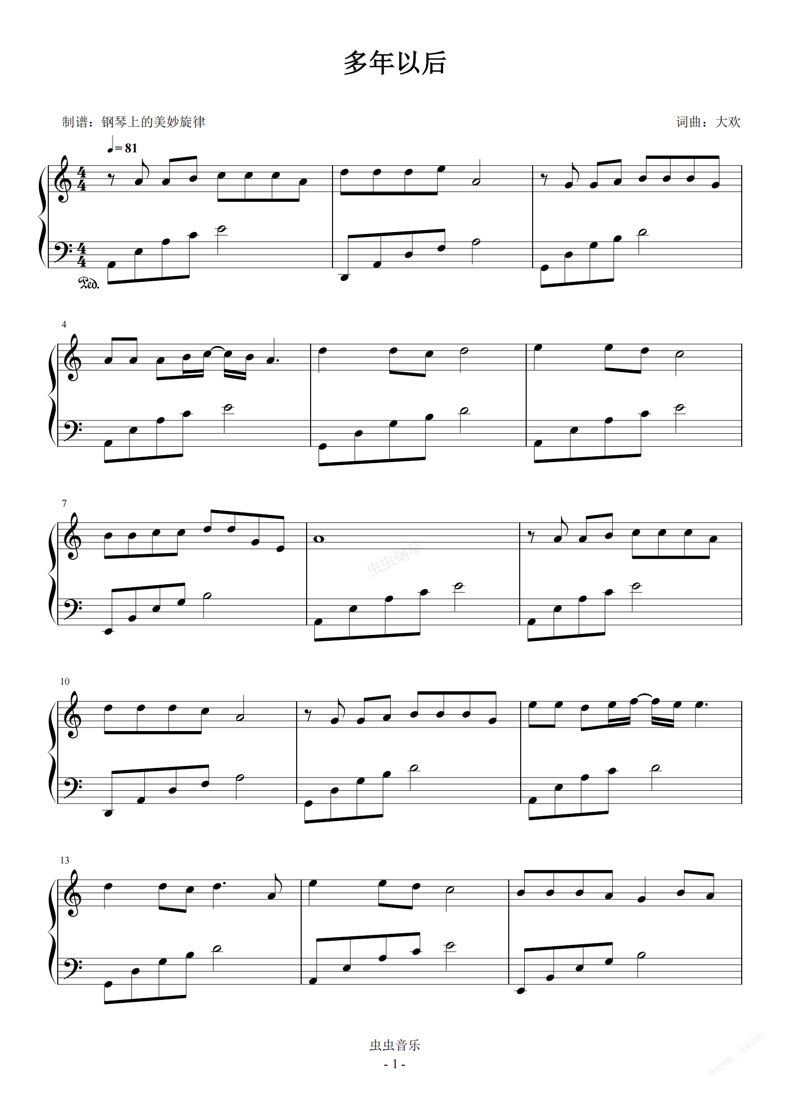 钢琴谱:多年以后 C调简易版 抖音热歌