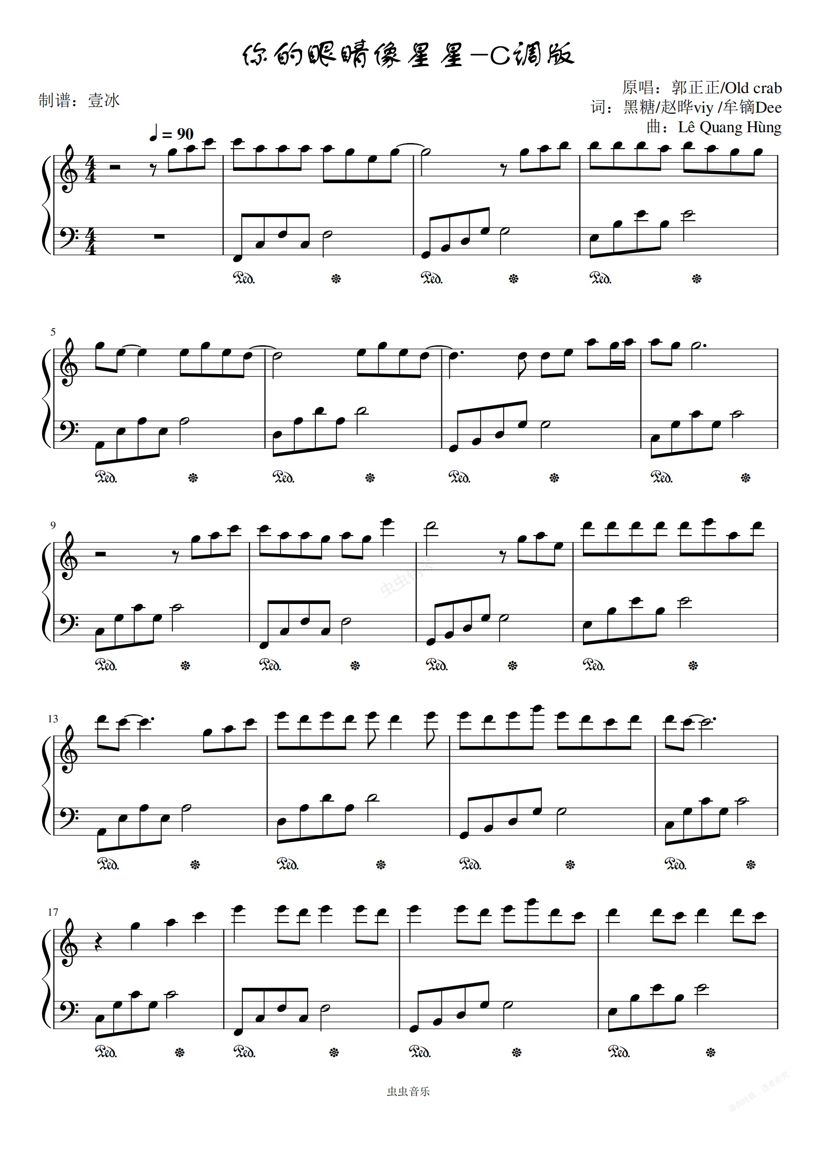 钢琴谱:你的眼睛像星星-C调简单易上手