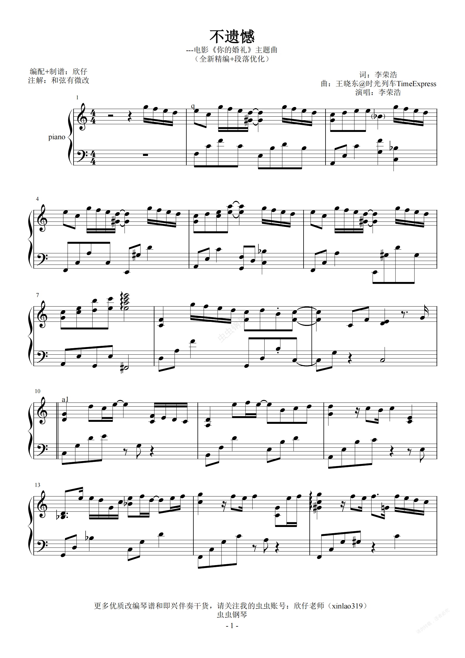 钢琴谱:李荣浩-C《不遗憾》(《你的婚礼》主题曲-全新精编+段落优化)