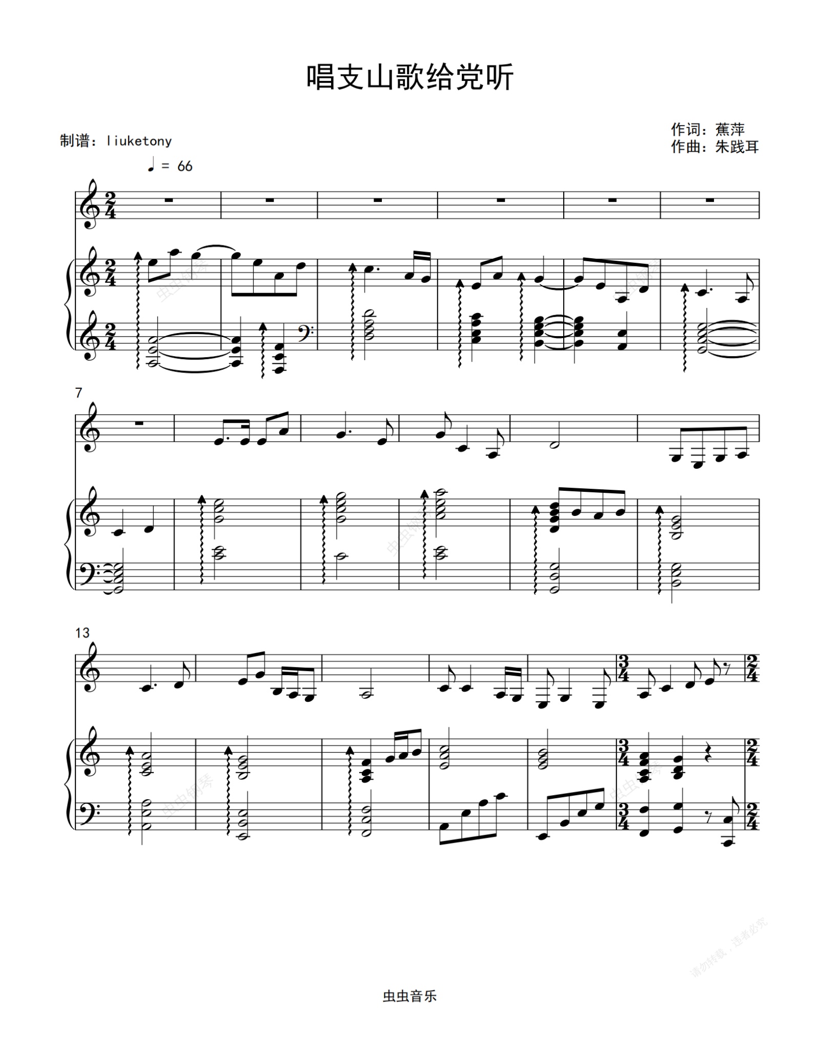 钢琴谱:唱支山歌给党听 - 韩红 钢琴伴奏谱