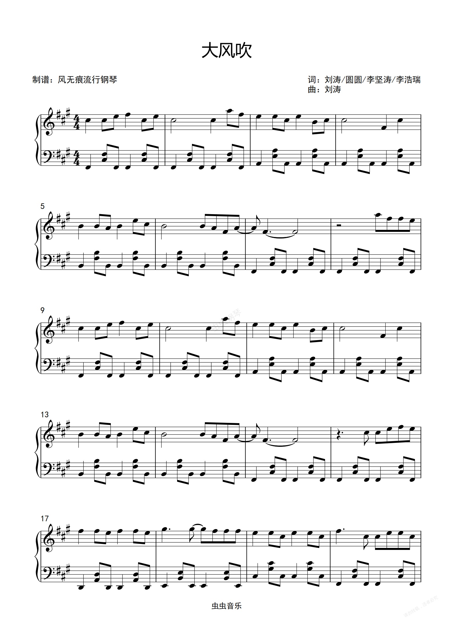 钢琴谱:原调-大风吹-王赫野〖简易动听〗