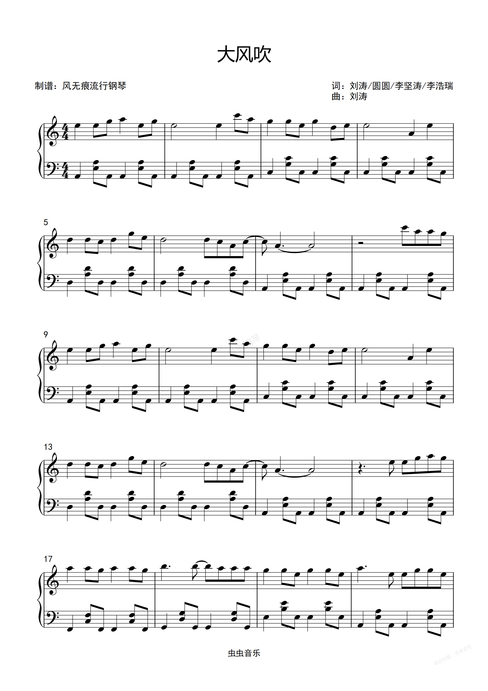 钢琴谱:C调-大风吹-王赫野〖简易动听〗