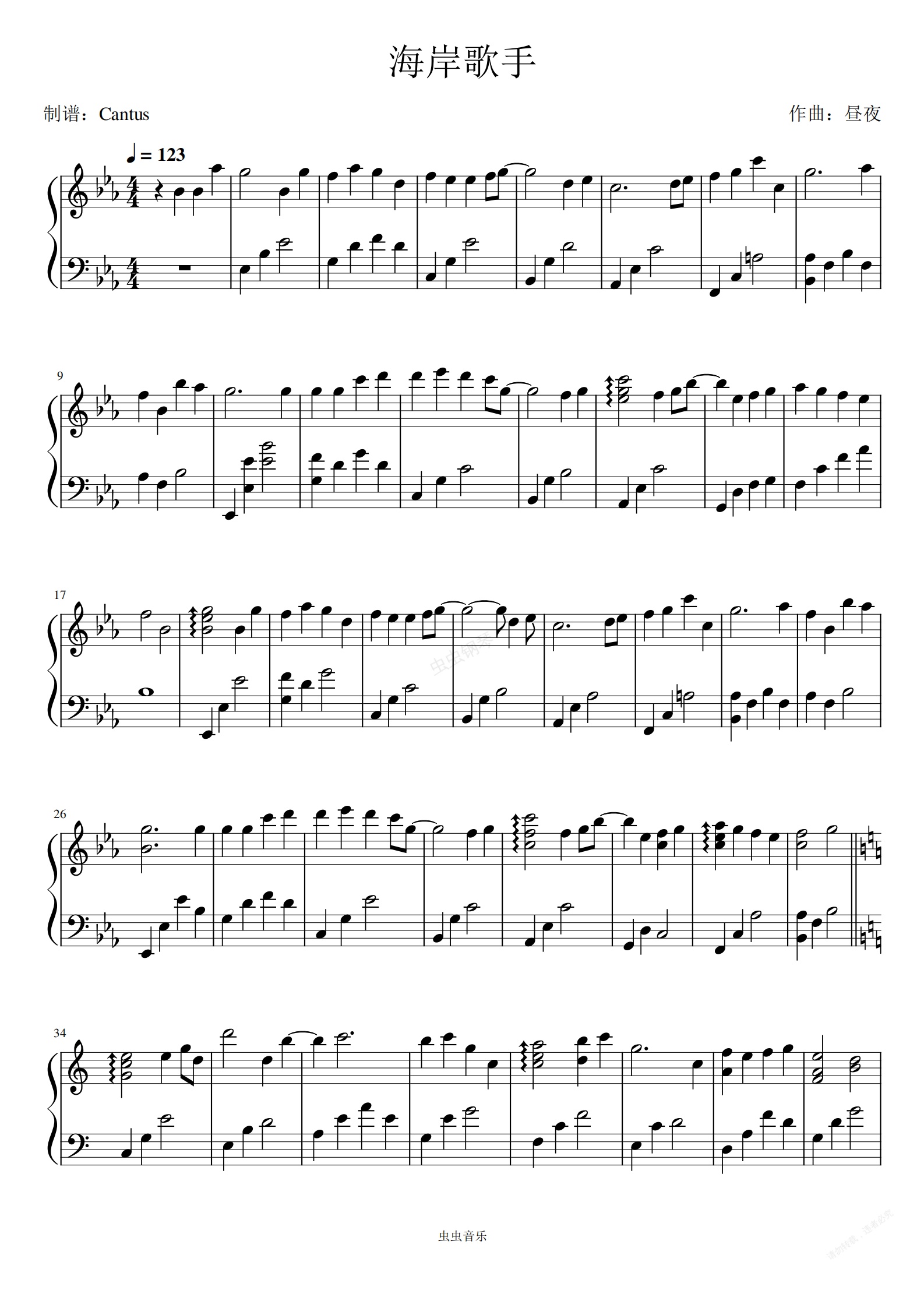 钢琴谱:海岸歌手-昼夜
