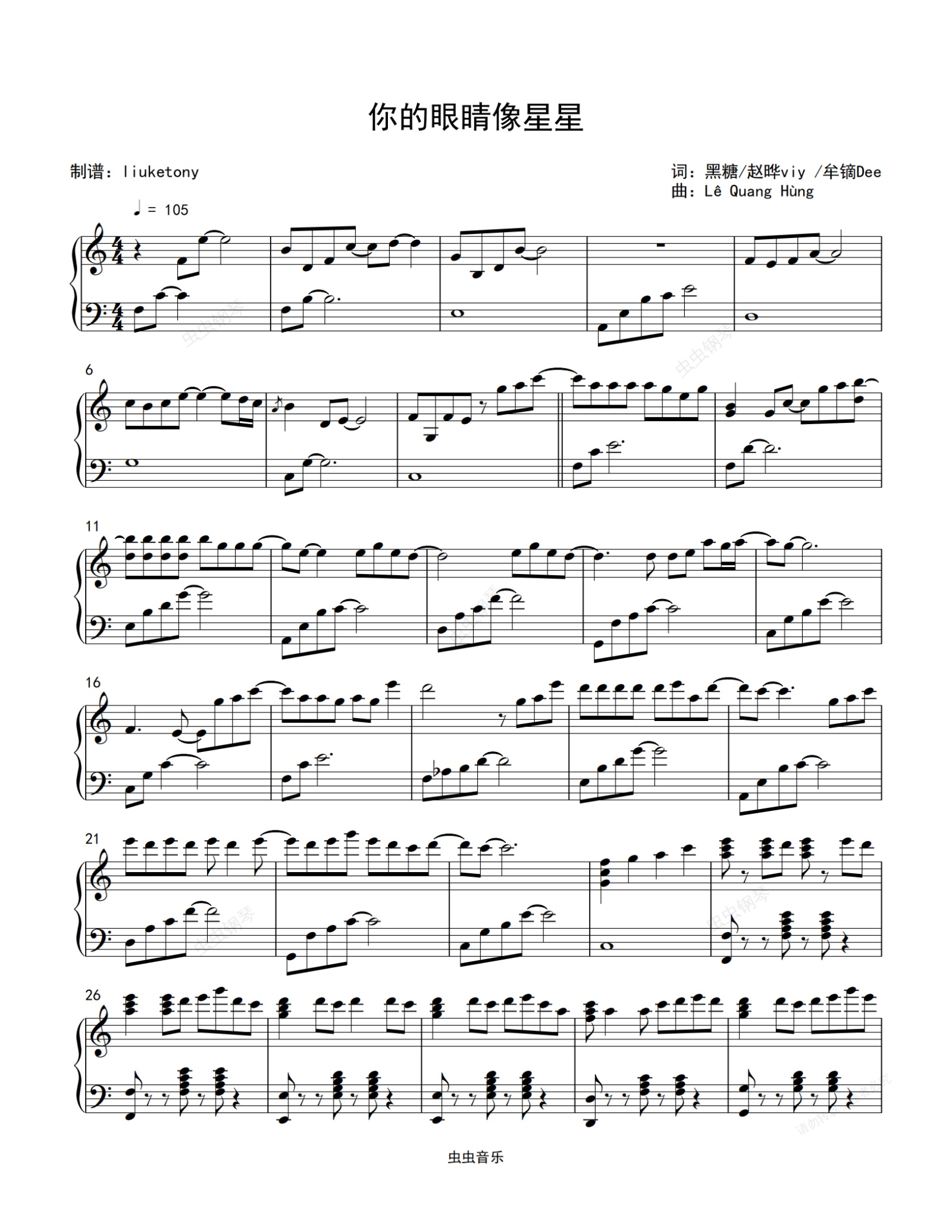 钢琴谱:你的眼睛像星星 - 钢琴独奏谱C调