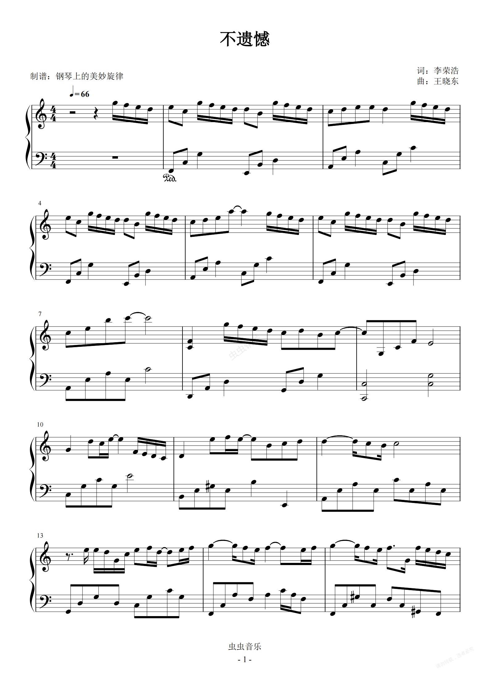 钢琴谱:不遗憾 你的婚礼 主题曲 C调简易版 李荣浩