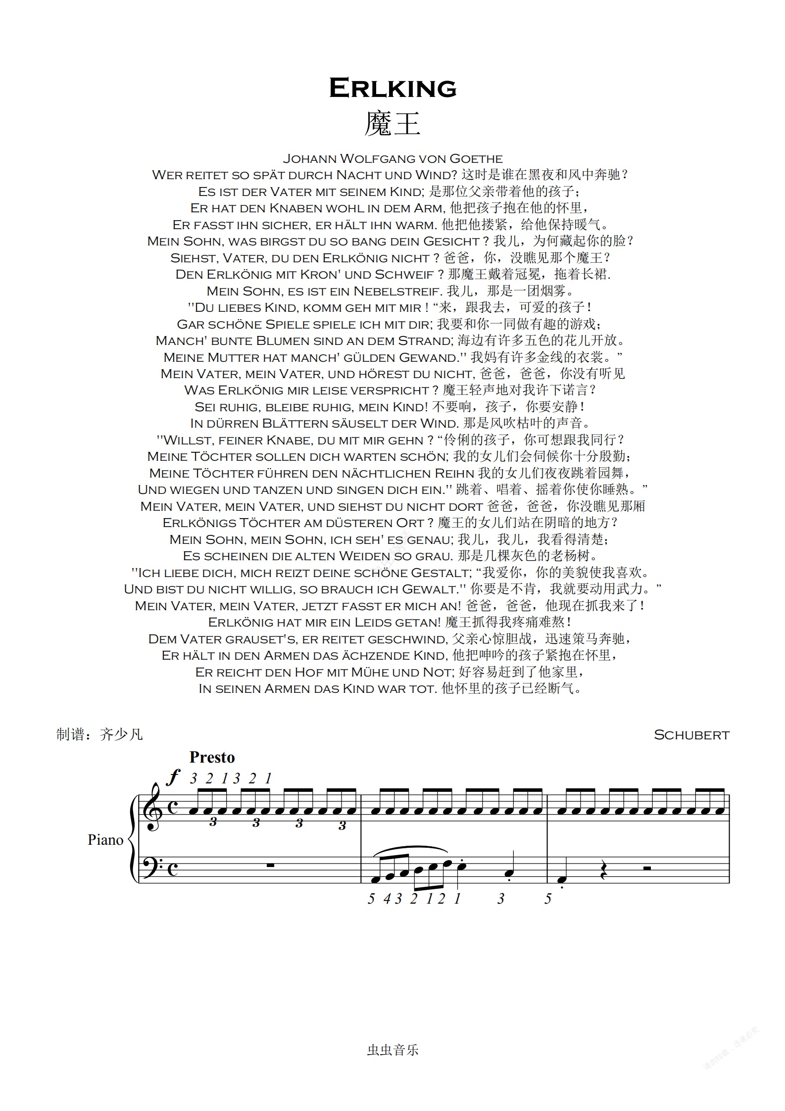 奥地利作曲家舒伯特根据歌德同名诗创作,作于1815年。当时作者只有18岁,这首叙事曲被编为作品第1号。全诗的故事情节:父亲怀抱发高烧的孩子在黑夜的森林里骑着马飞驰,森林中的魔王不断引诱孩子,孩子发出阵阵惊呼,最后终于在父亲怀抱中死去。歌曲采用通谱手法,一气呵成,气势宏大。诗歌中叙述者、父亲、孩子及魔王四个不同角色由不同的音调体现出来。作者充分展示了戏剧性的情节,如钢琴伴奏模拟马蹄疾奔的节奏贯穿全曲,低音奏出的风声描绘出夜幕中的森林冷风飒讽、咄咄逼人的情景,烘托出沉闷恐惧的气氛。作者还以小二度上行模仿孩子的惊呼,形象地刻画出孩子愈加惊恐的神情。