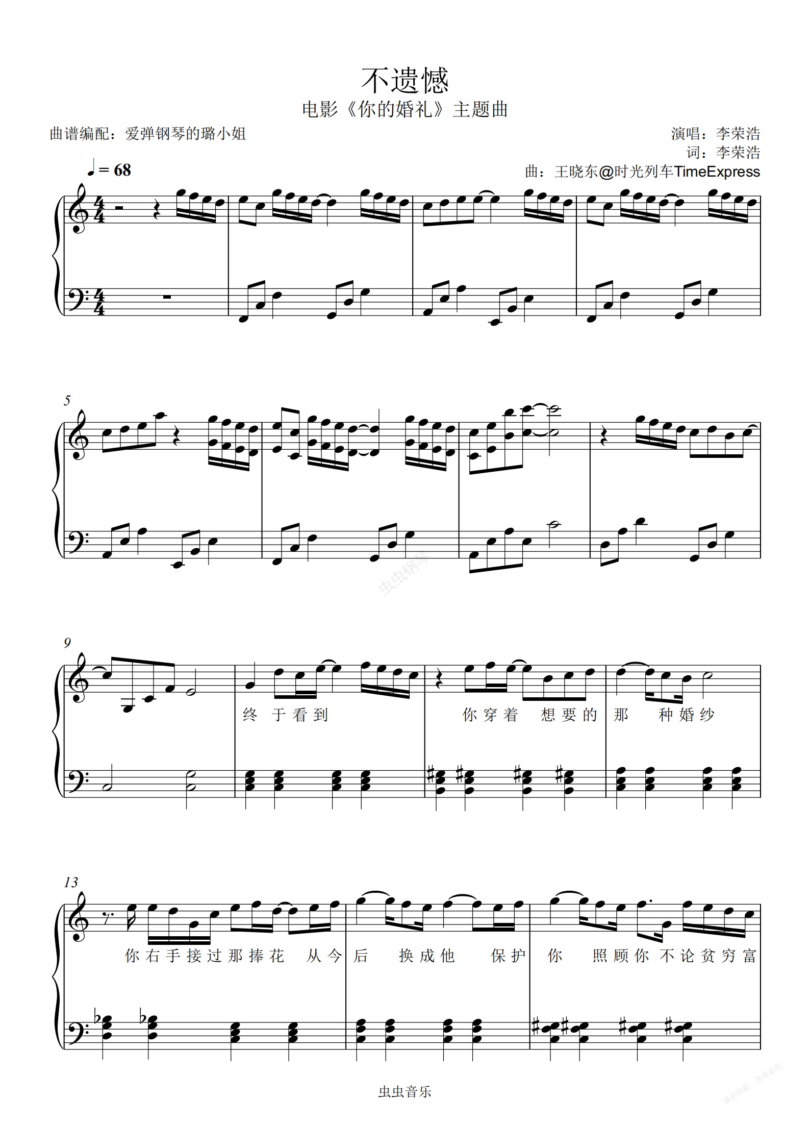 钢琴谱:不遗憾 - 电影《你的婚礼》主题曲 - C调简单易上手 - 附歌词