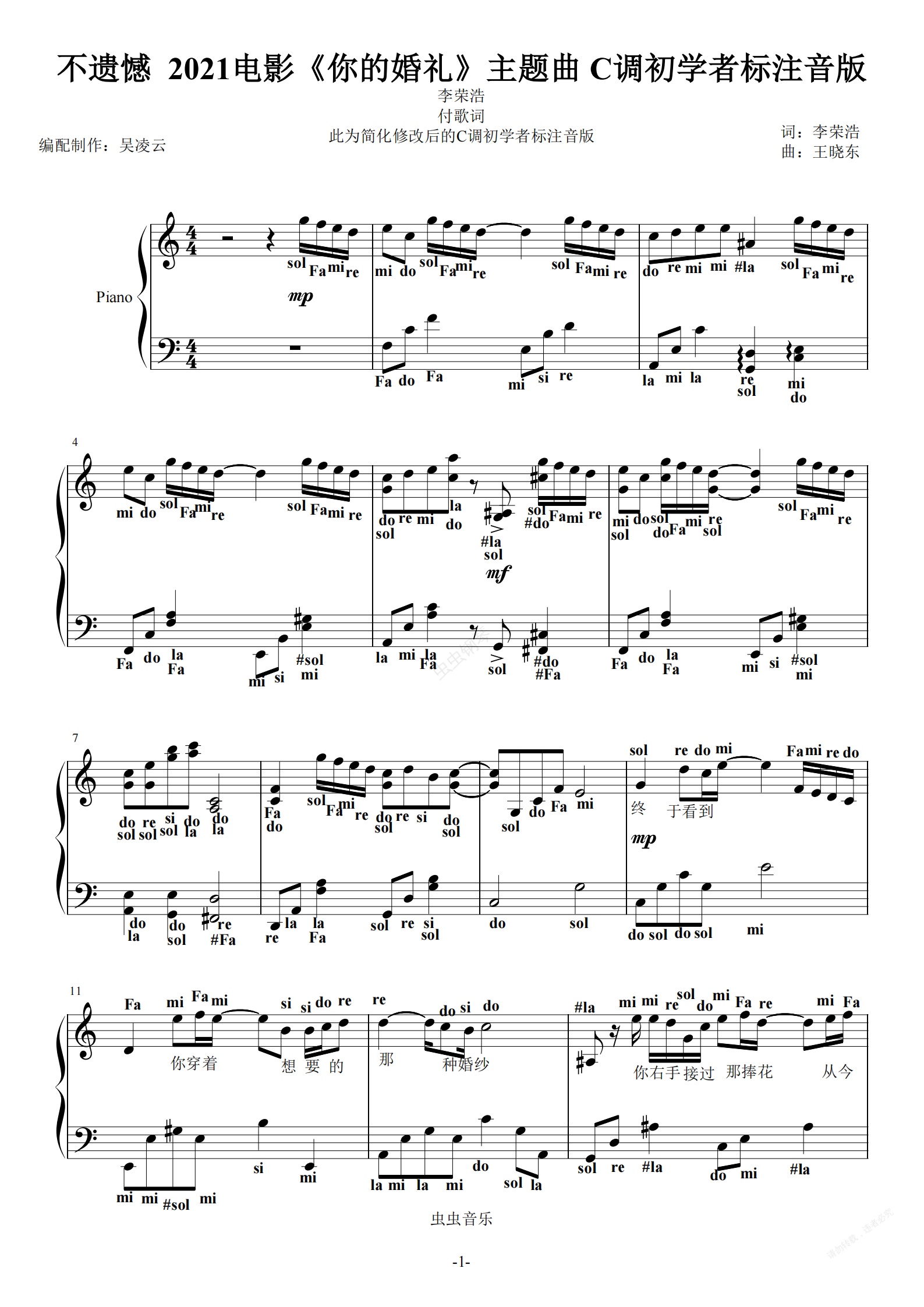 钢琴谱:不遗憾 李荣浩 C调初学者标注音版 2021电影《你的婚礼》主题曲 吴凌云制