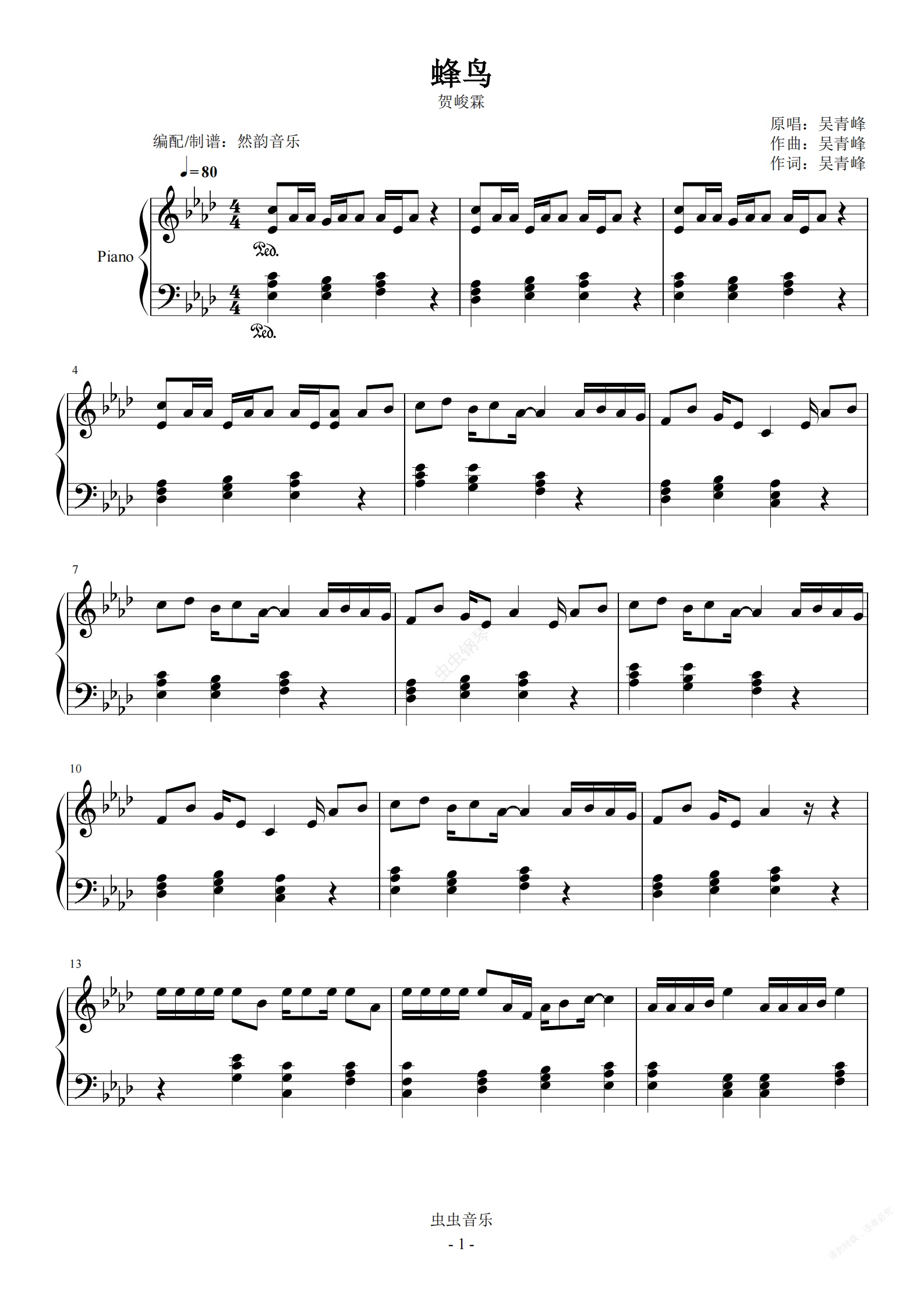 钢琴谱:蜂鸟-贺峻霖 TNT时代少年团