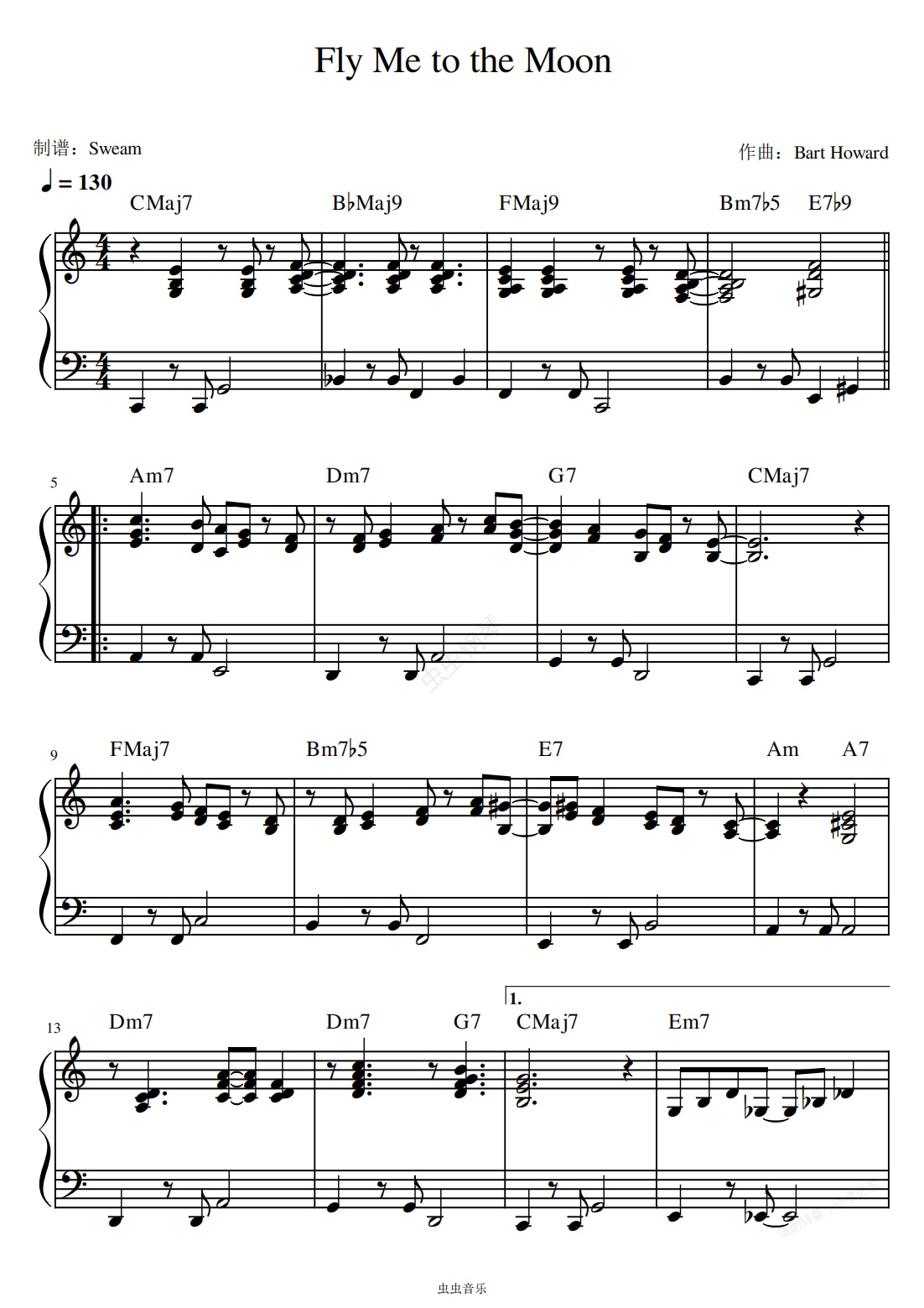 钢琴谱:Fly me to the moon(Bossa nova摇摆清爽夏日C调便携版+和弦标注)