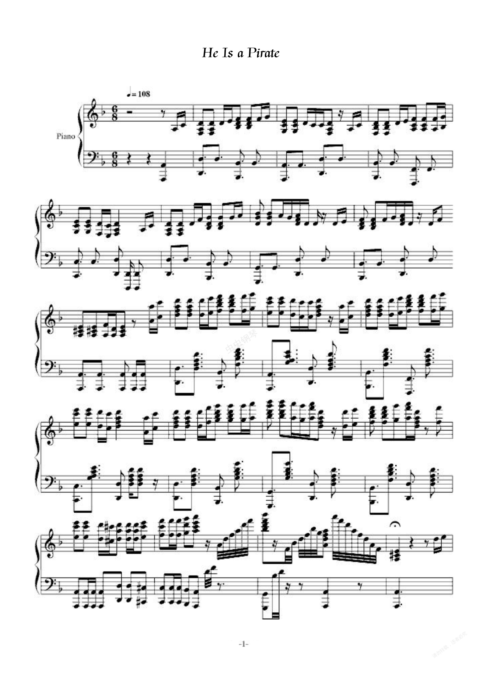 钢琴谱:He‘s a Pirate (加勒比海盗主题曲 F大调)