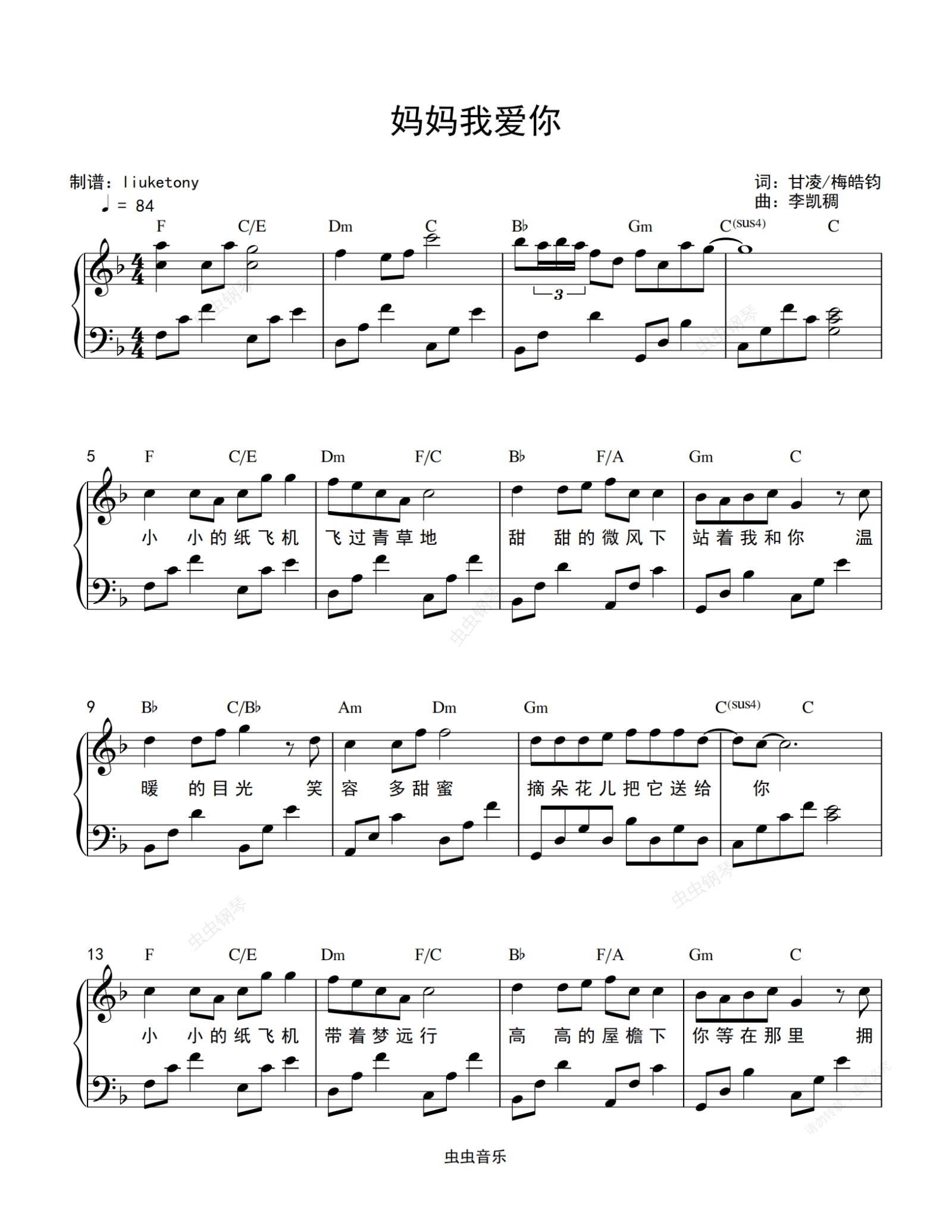 钢琴谱:妈妈我爱你 - 李昕融 钢琴独奏原调