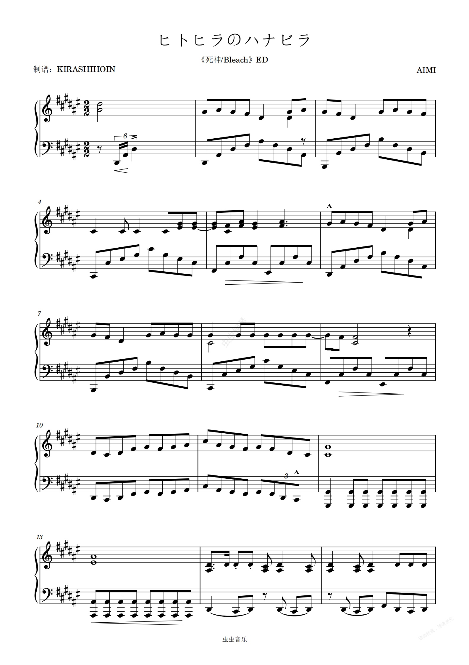 钢琴谱:一片花瓣/ヒトヒラのハナビラ(《死神/Bleach》ED)