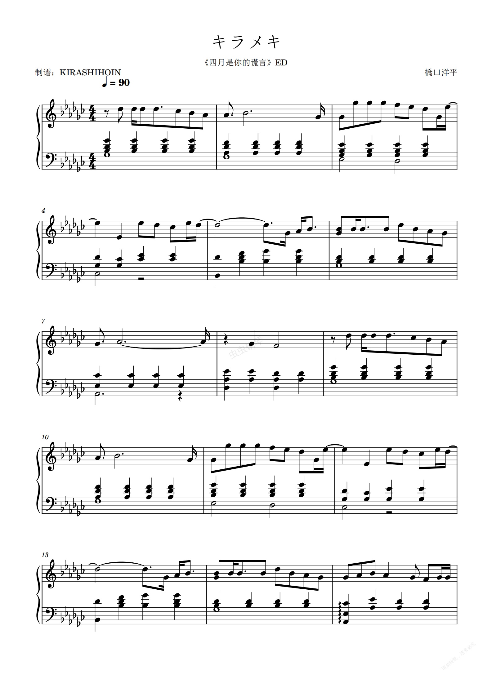 钢琴谱:キラメキ(《四月是你的谎言》ED)