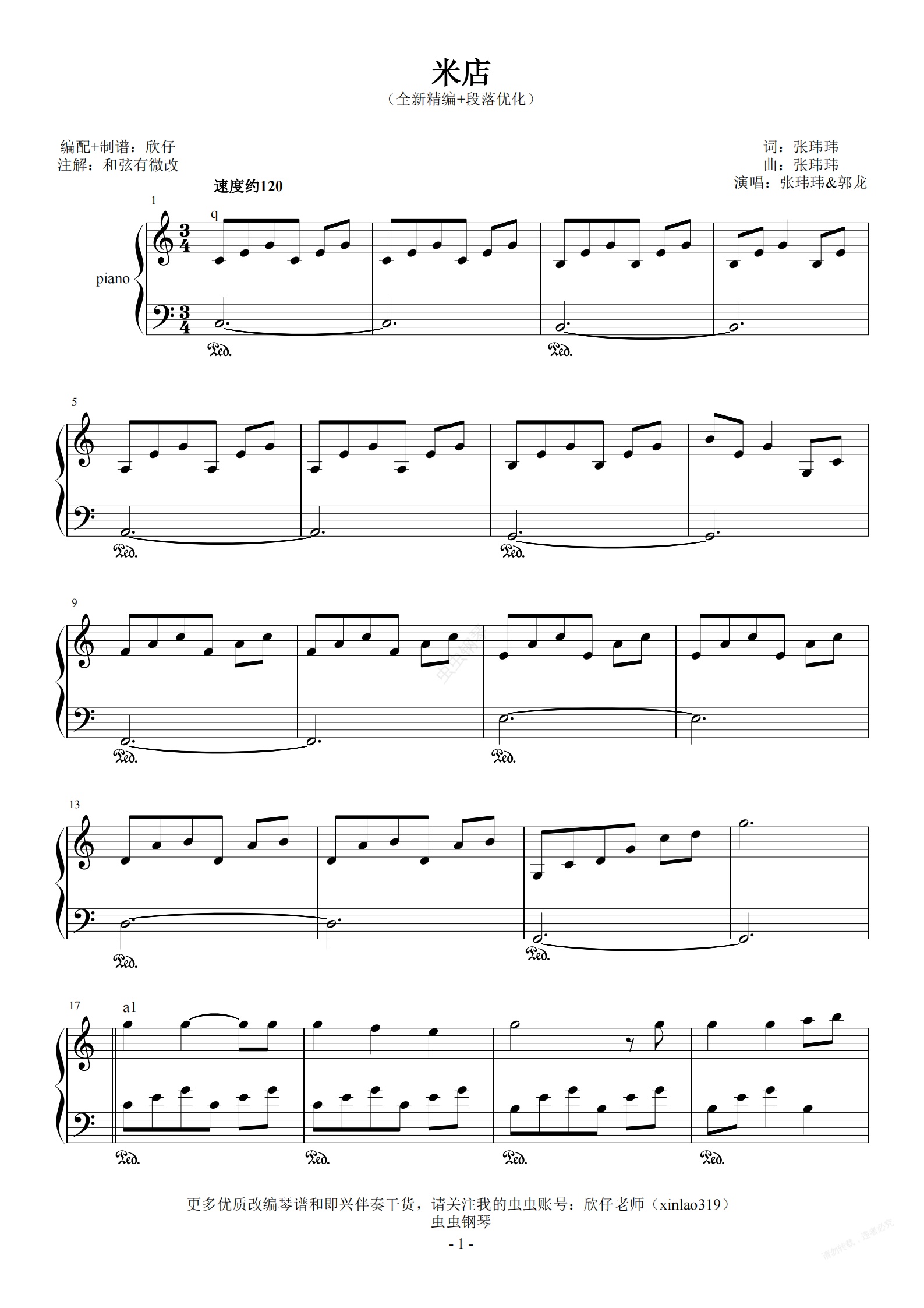 钢琴谱:C调《米店》(民谣抒情改编+段落优化)