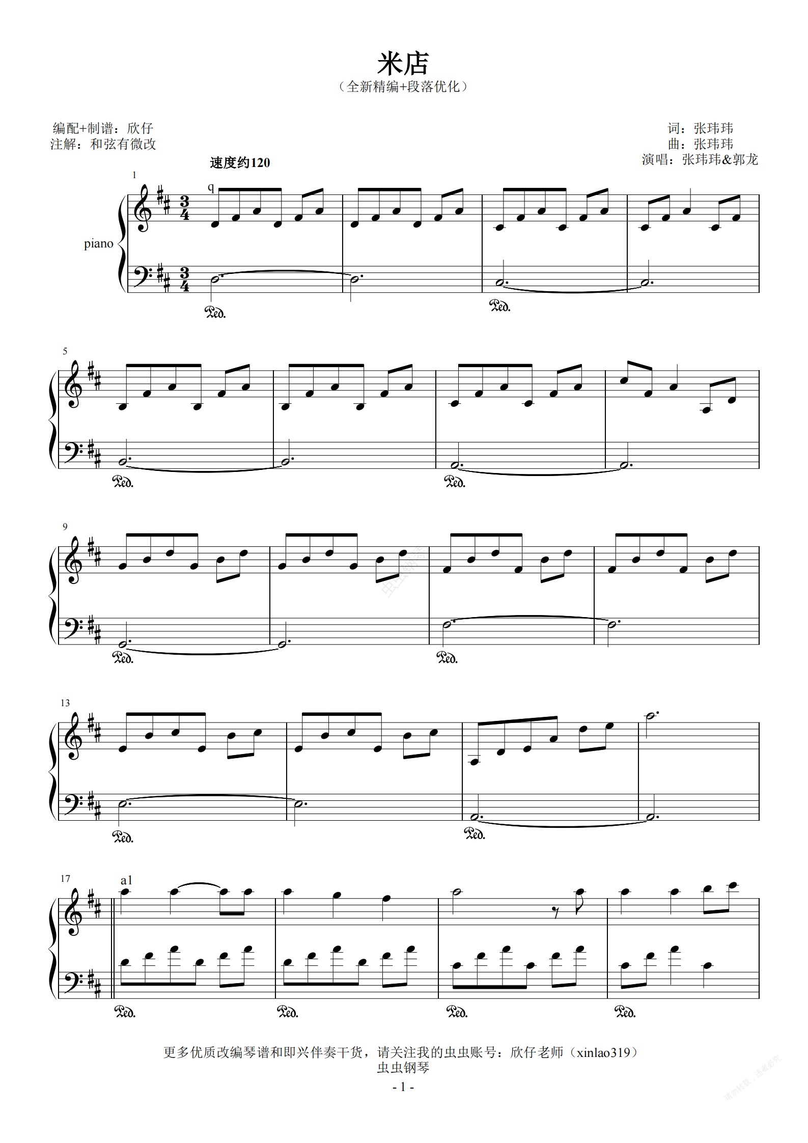 钢琴谱:D调《米店》(抒情改编+段落优化)