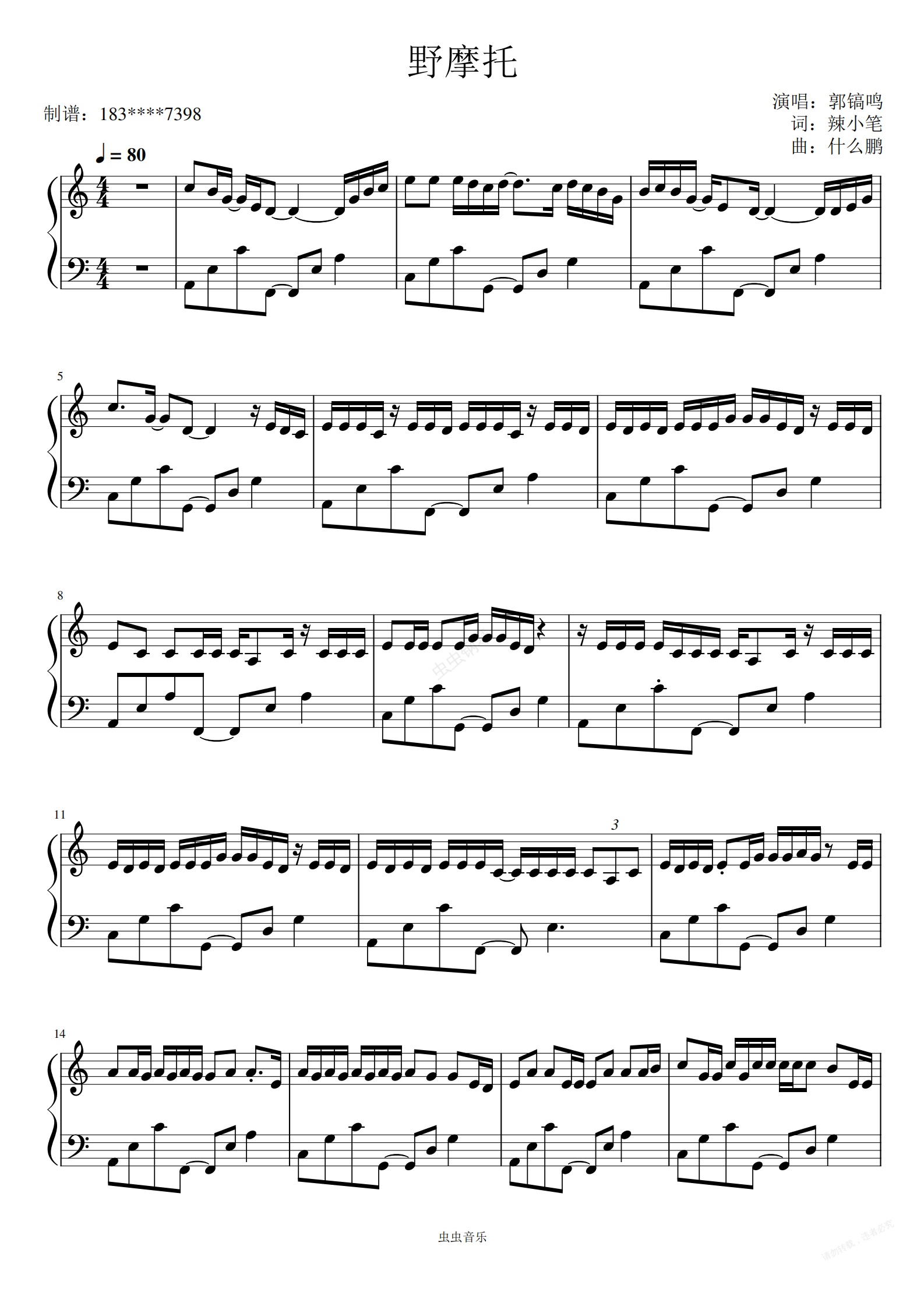 钢琴谱:性价比超高版 野摩托 C调原版