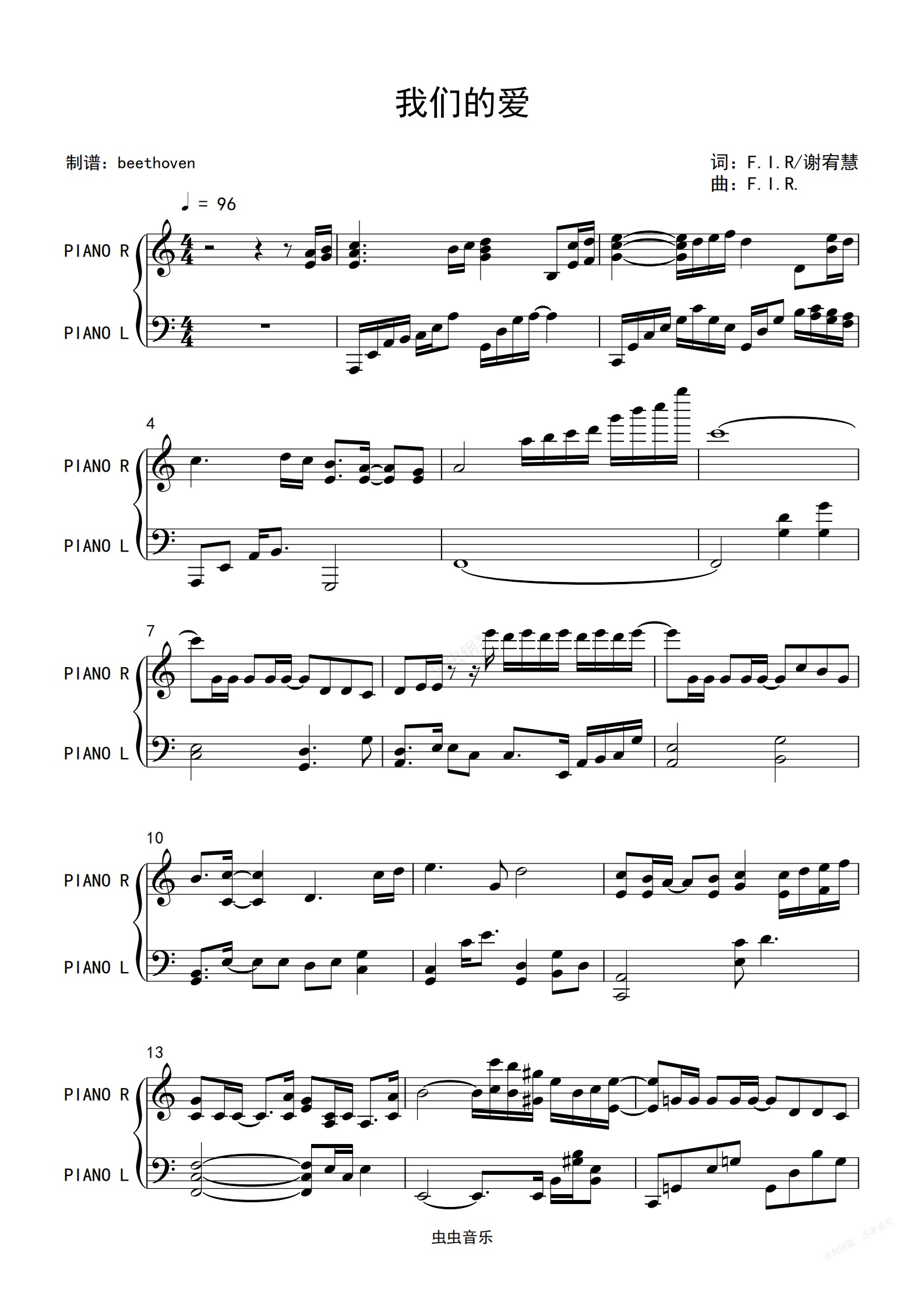 钢琴谱:我们的爱 钢琴独奏 F.I.R.(飞儿乐团)
