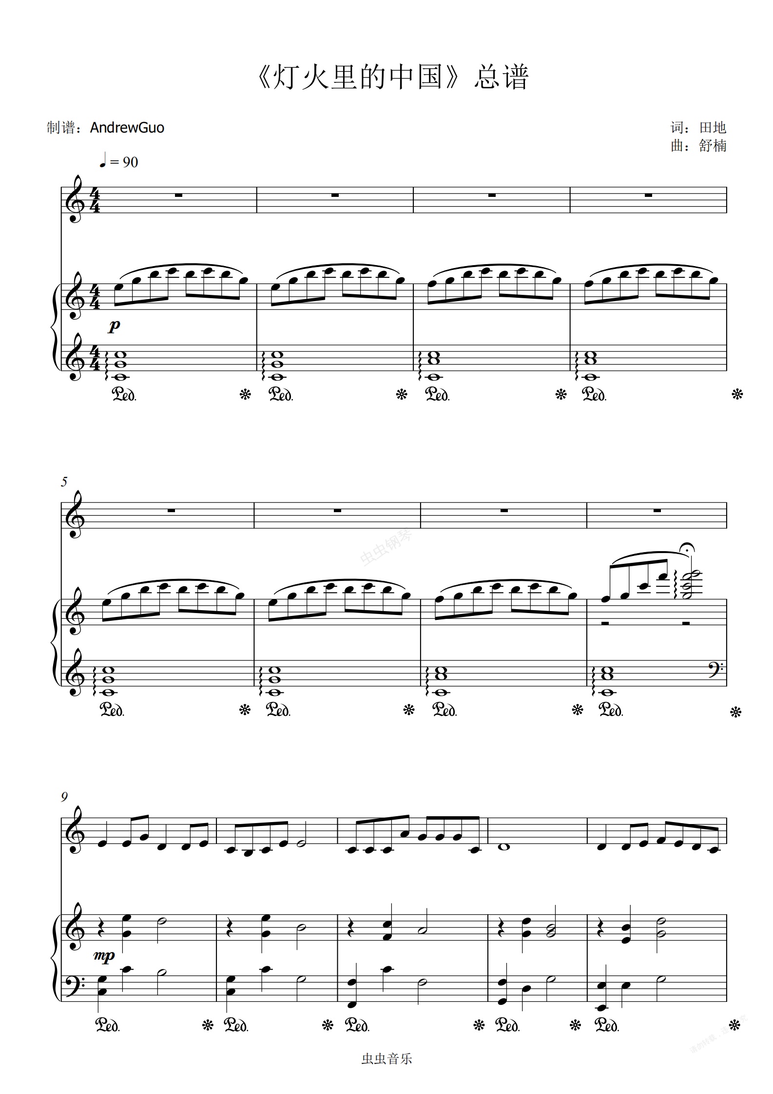 钢琴谱:《灯火里的中国》声部+钢琴 - AndrewGuo编配