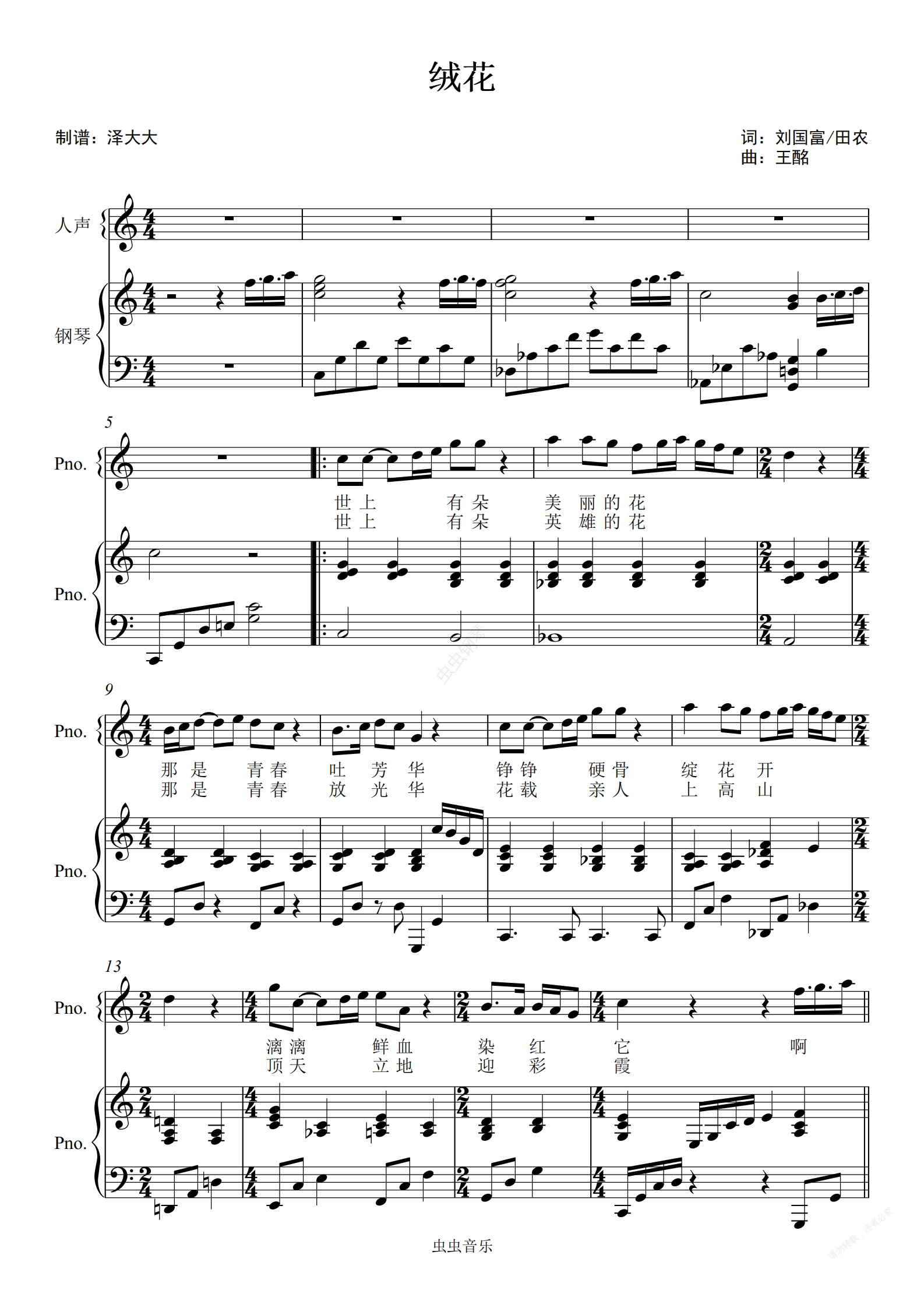 钢琴谱:绒花【C调红歌完美弹唱附词】泽大大 韩红