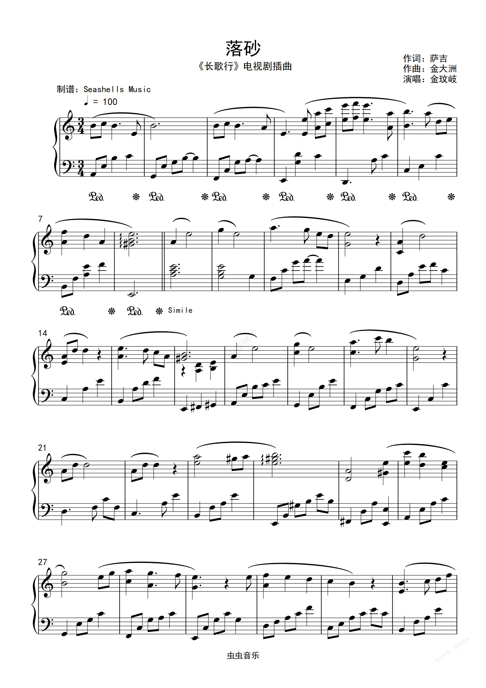 钢琴谱:金玟岐-《落砂》精编钢琴独奏 长歌行插曲
