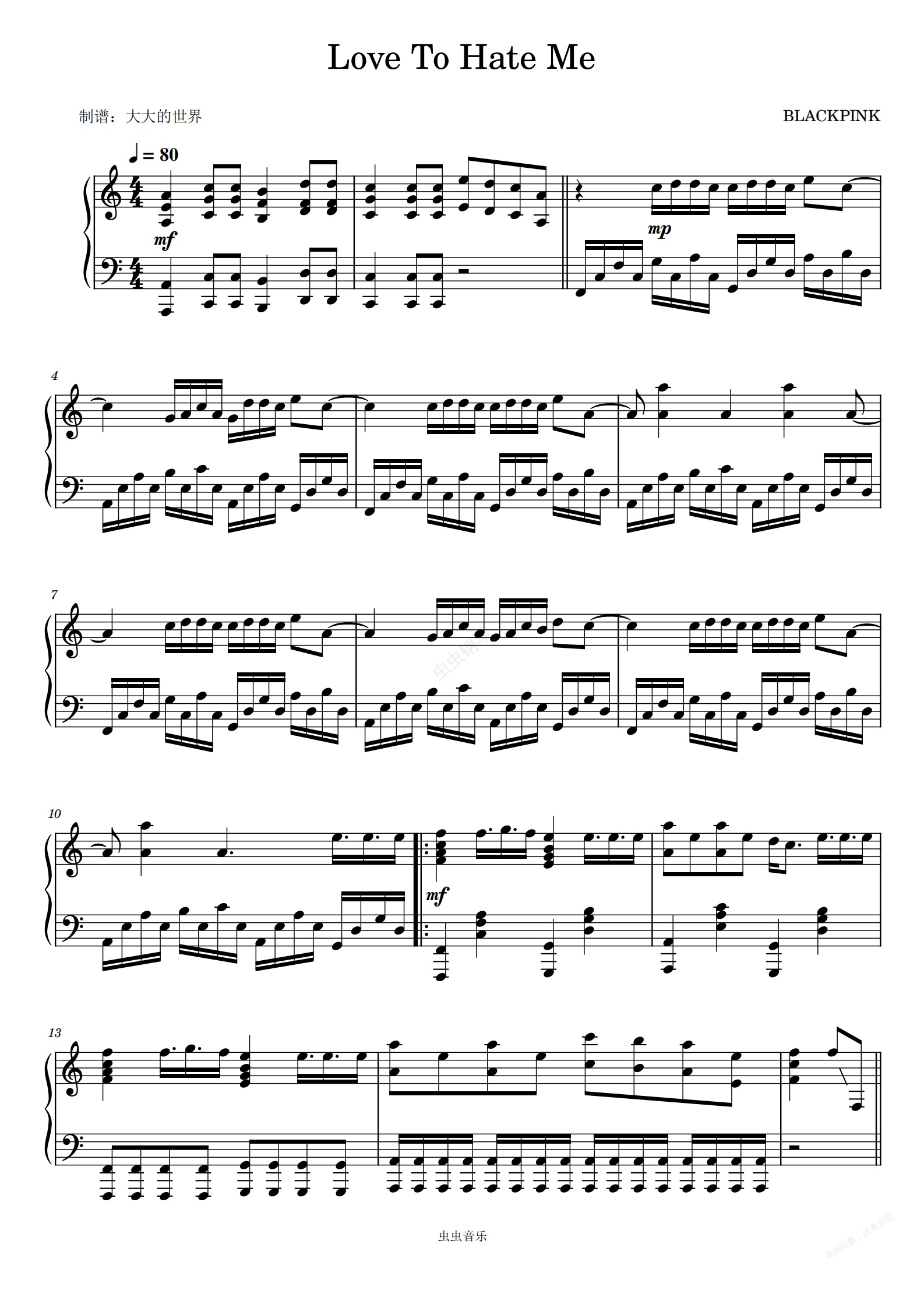 钢琴谱:Love To Hate Me【C调】