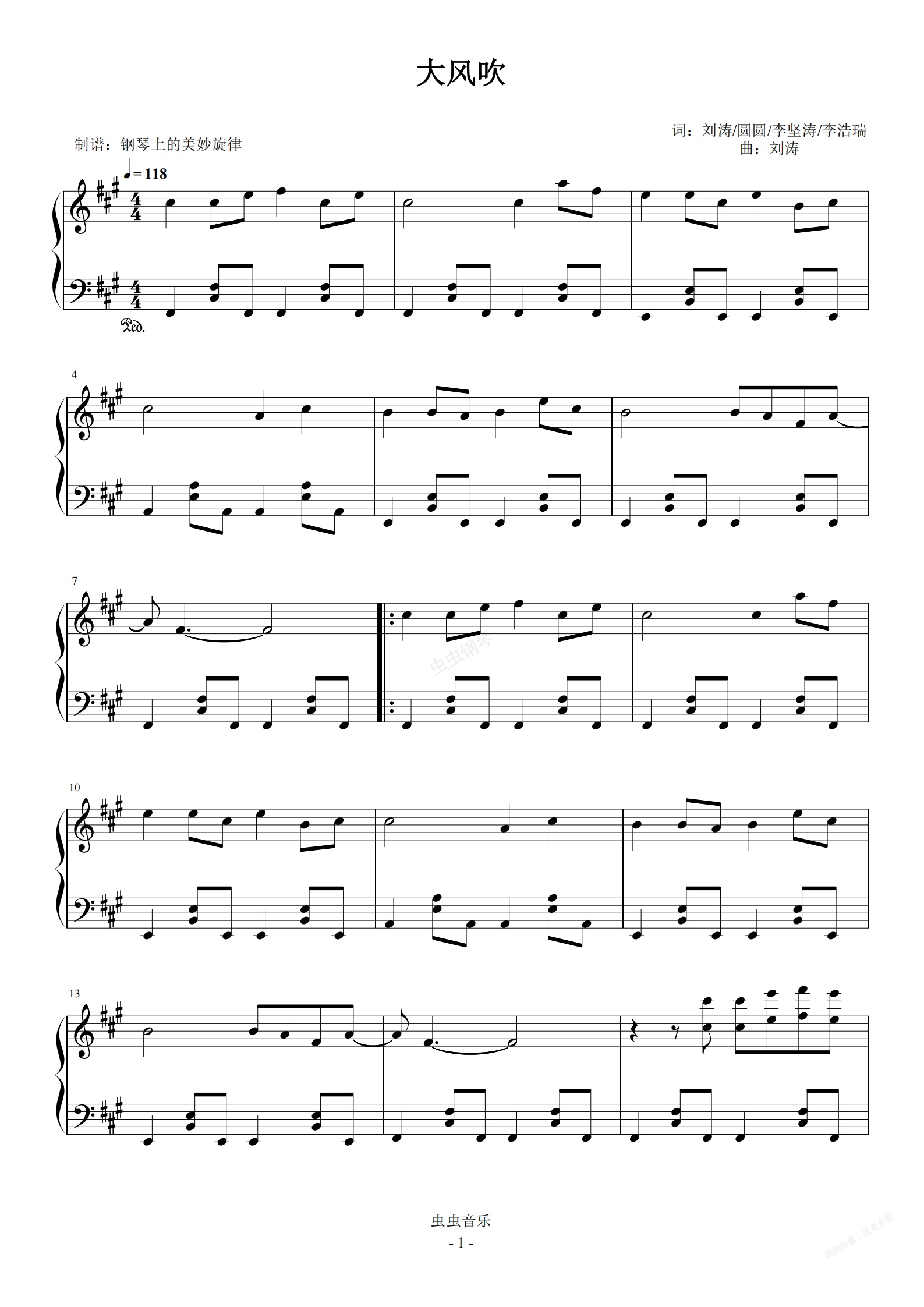 钢琴谱:大风吹 简易版 王赫野 刘惜君