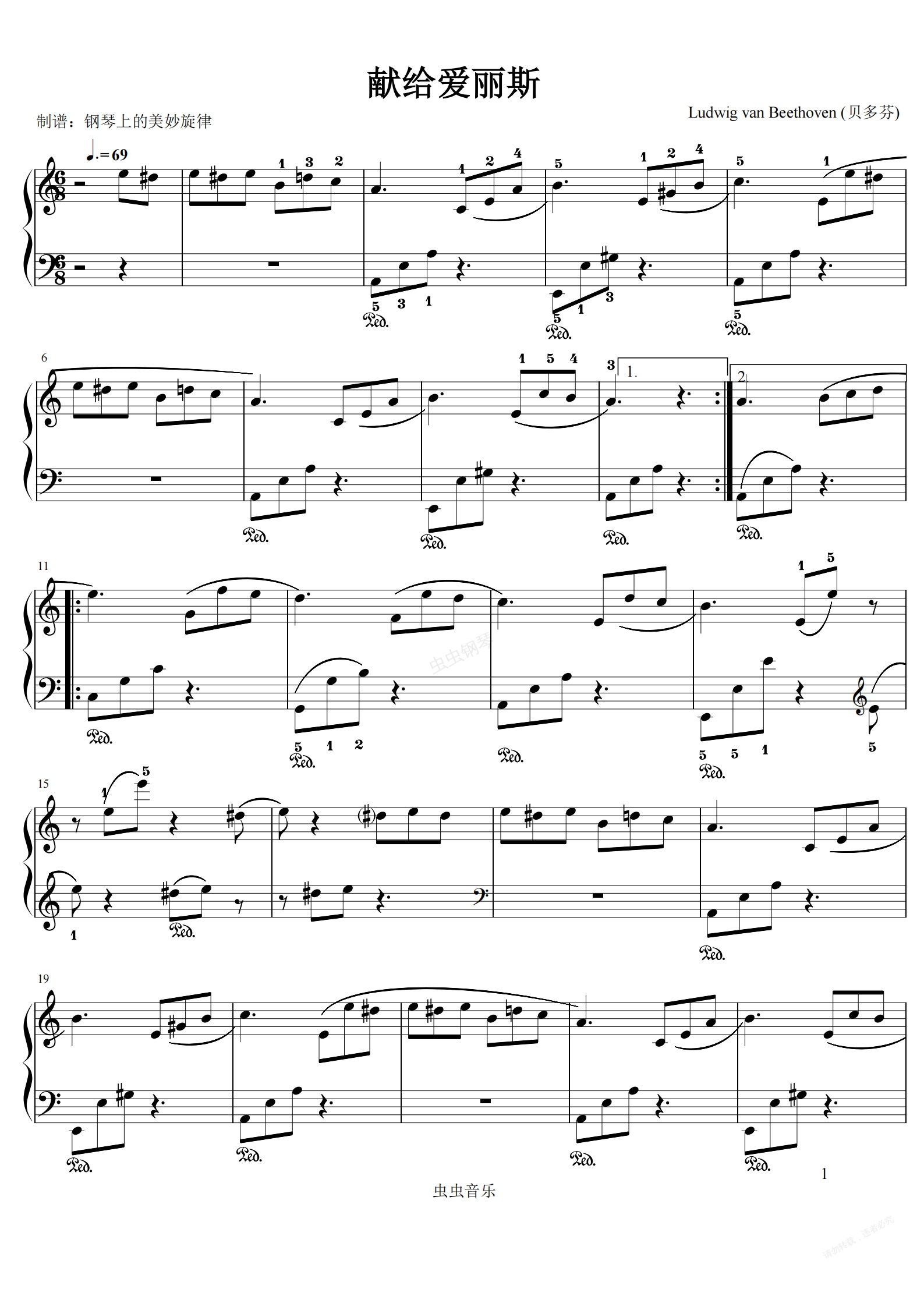 钢琴谱:献给爱丽丝 简易版 完整版本(abc 三段都有)