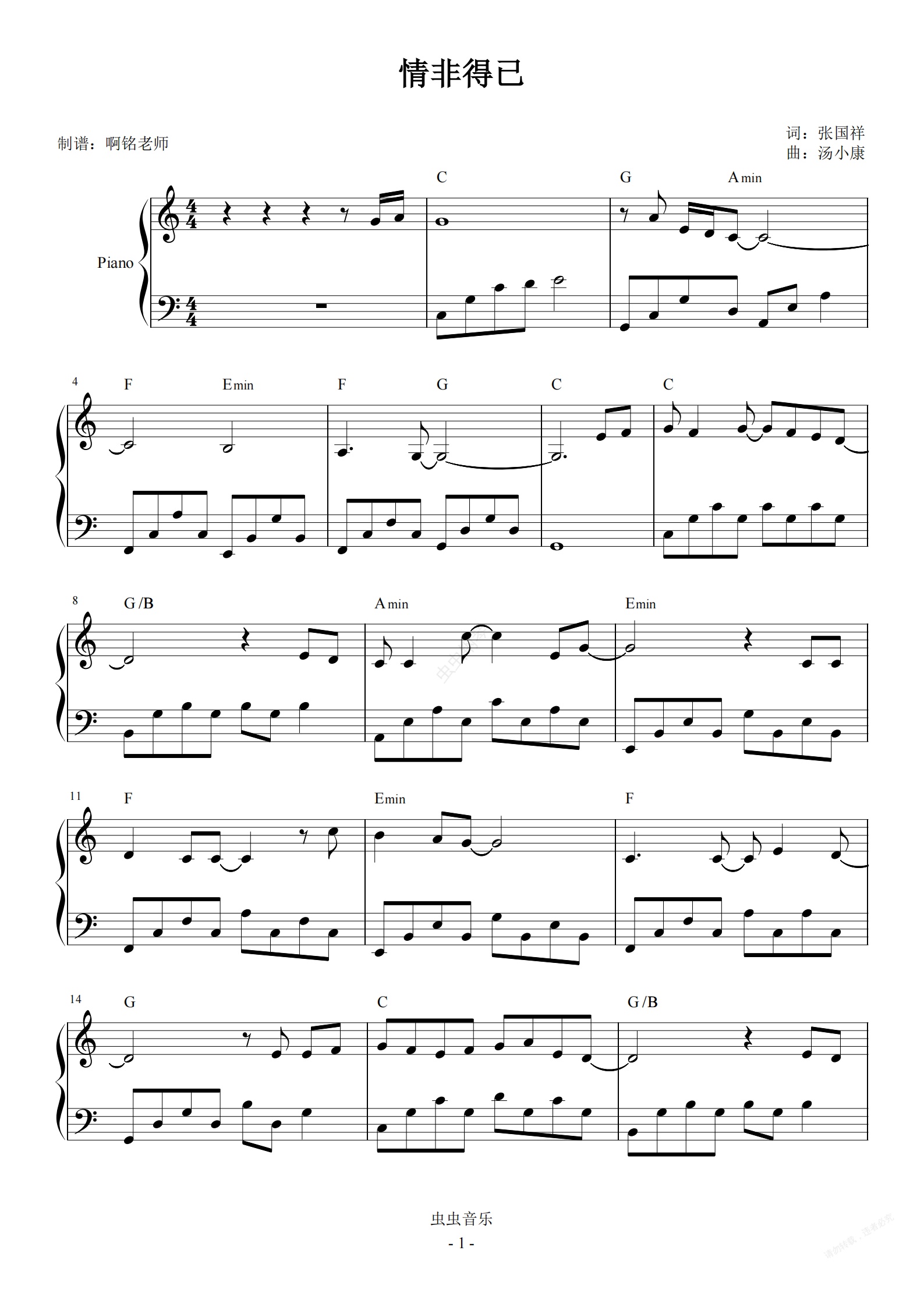 钢琴谱:情非得已 【简易 怀旧】
