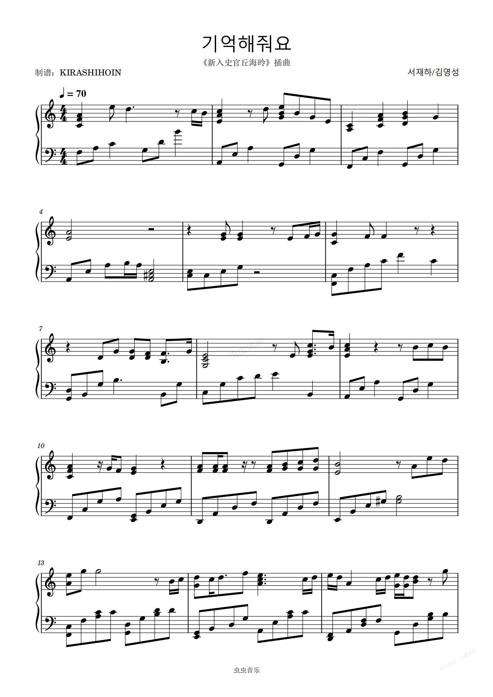 钢琴谱:기억해줘요(《新入史官丘海昤》插曲)