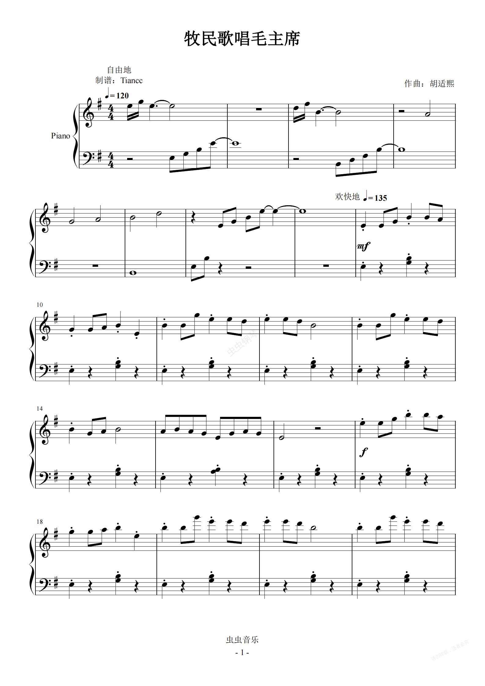 钢琴谱:《牧民歌唱毛主席》教学简化版,拜厄难度
