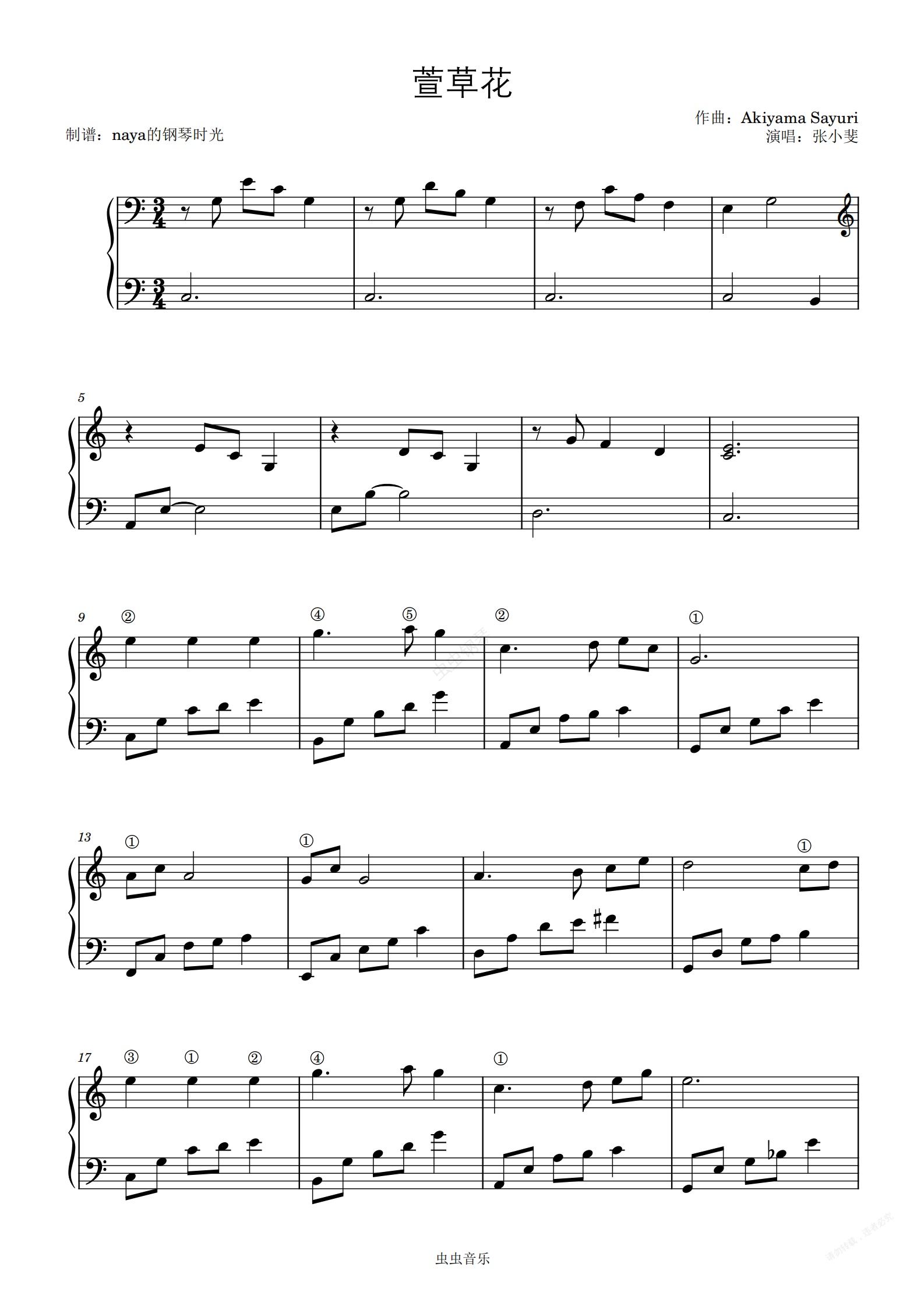 钢琴谱:萱草花——C调简单抒情版