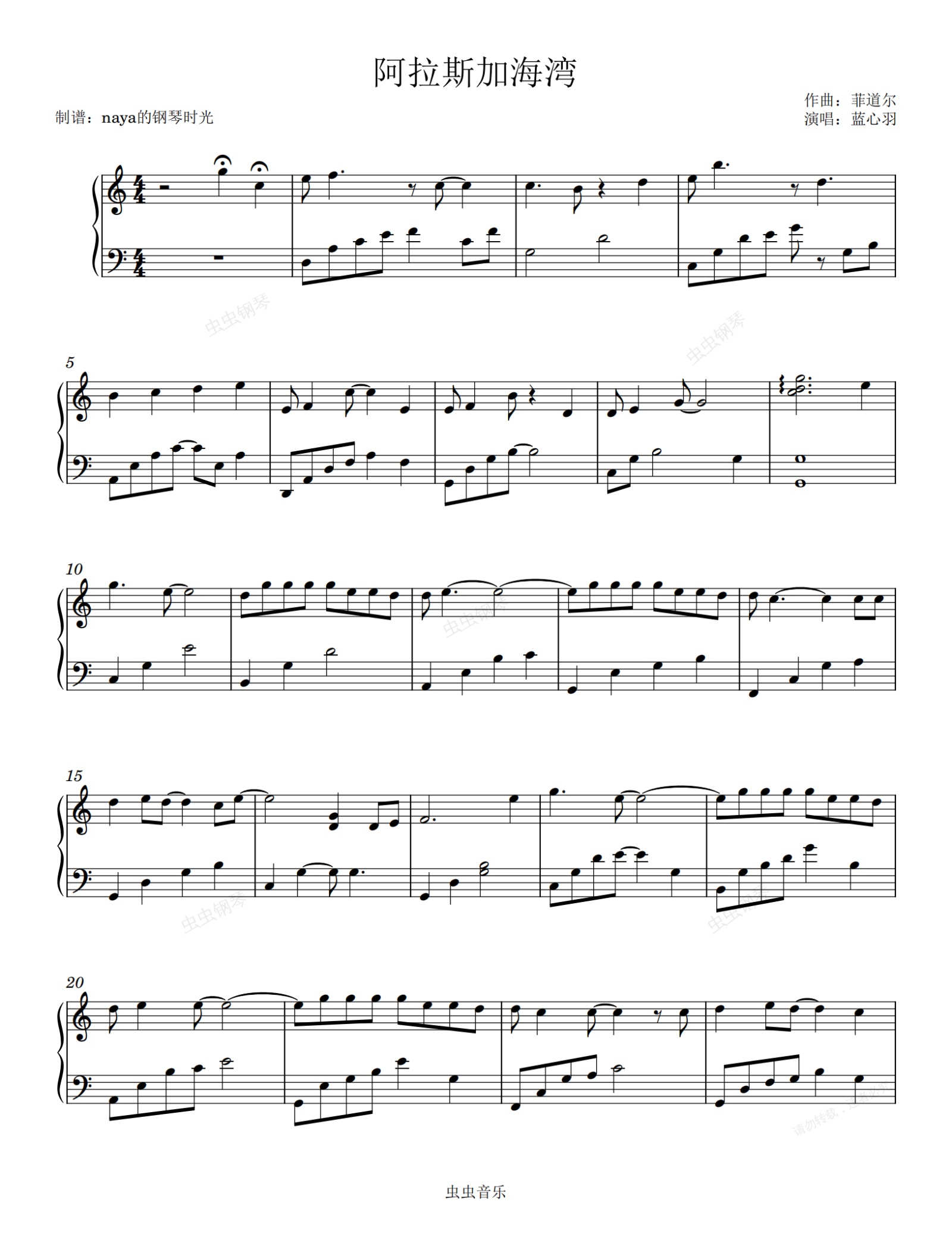 钢琴谱:阿拉斯加海湾——C调简易抒情版