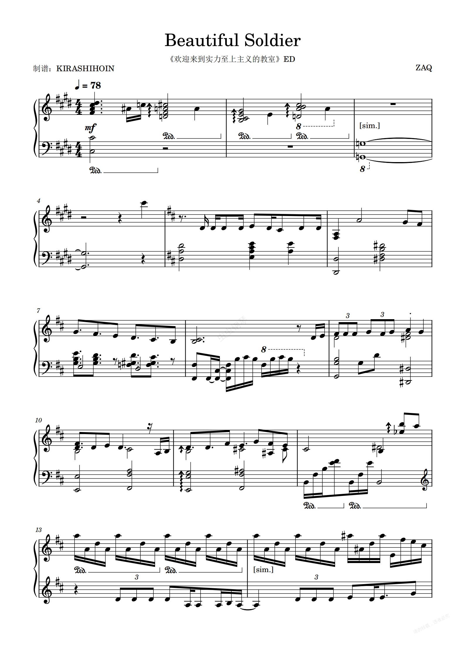 钢琴谱:Beautiful Soldier(《欢迎来到实力至上主义的教室》ED)