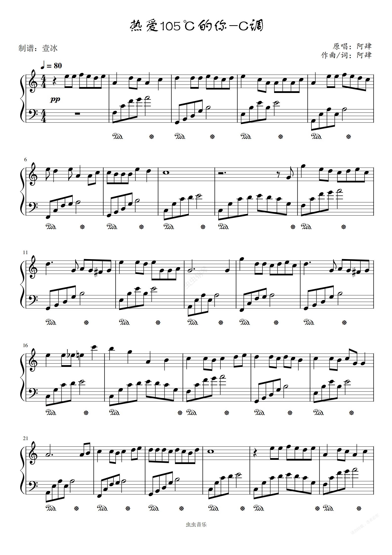 钢琴谱:热爱105℃的你-C调版