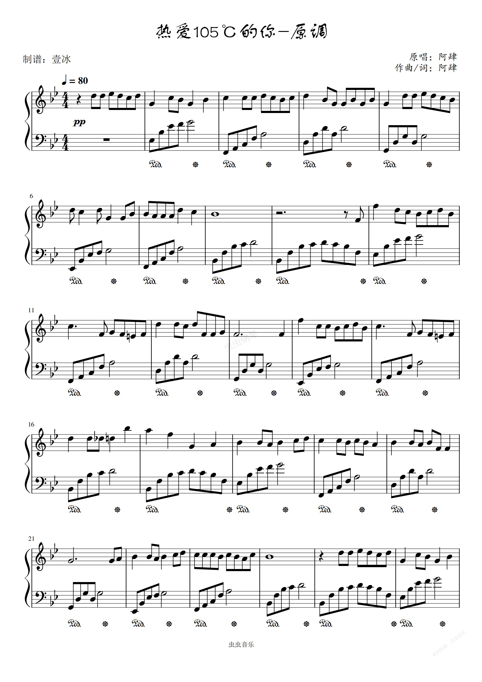 钢琴谱:热爱105℃的你-原调版