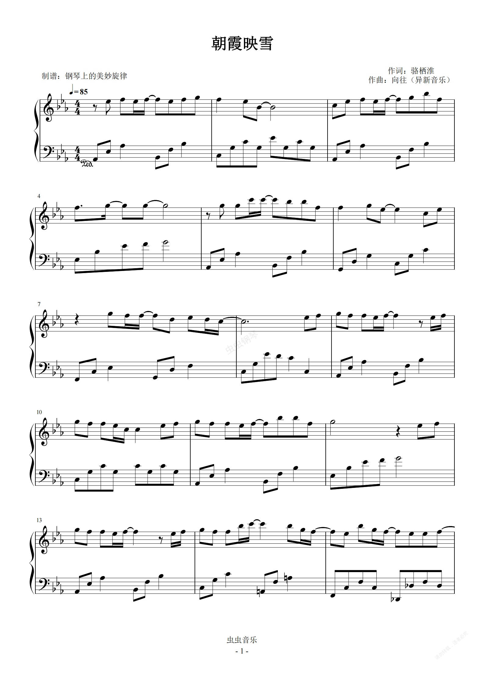 钢琴谱:朝霞映雪 问鹿三千 简易版