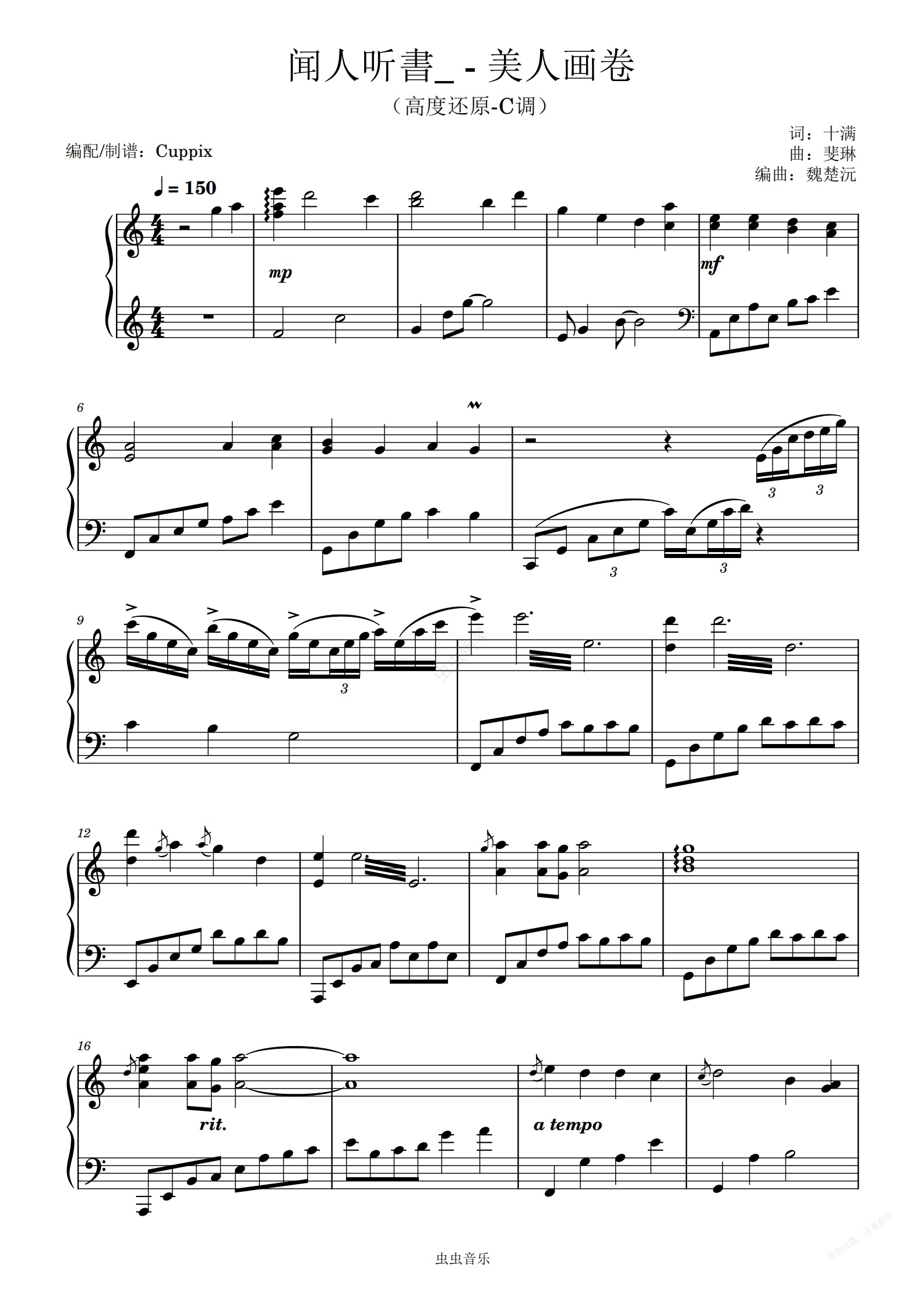 钢琴谱:闻人听書_《美人画卷》高度还原-C调版