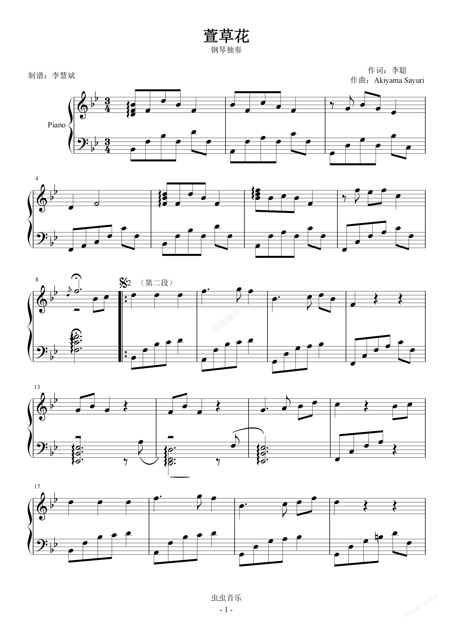 钢琴谱:萱草花(原调)