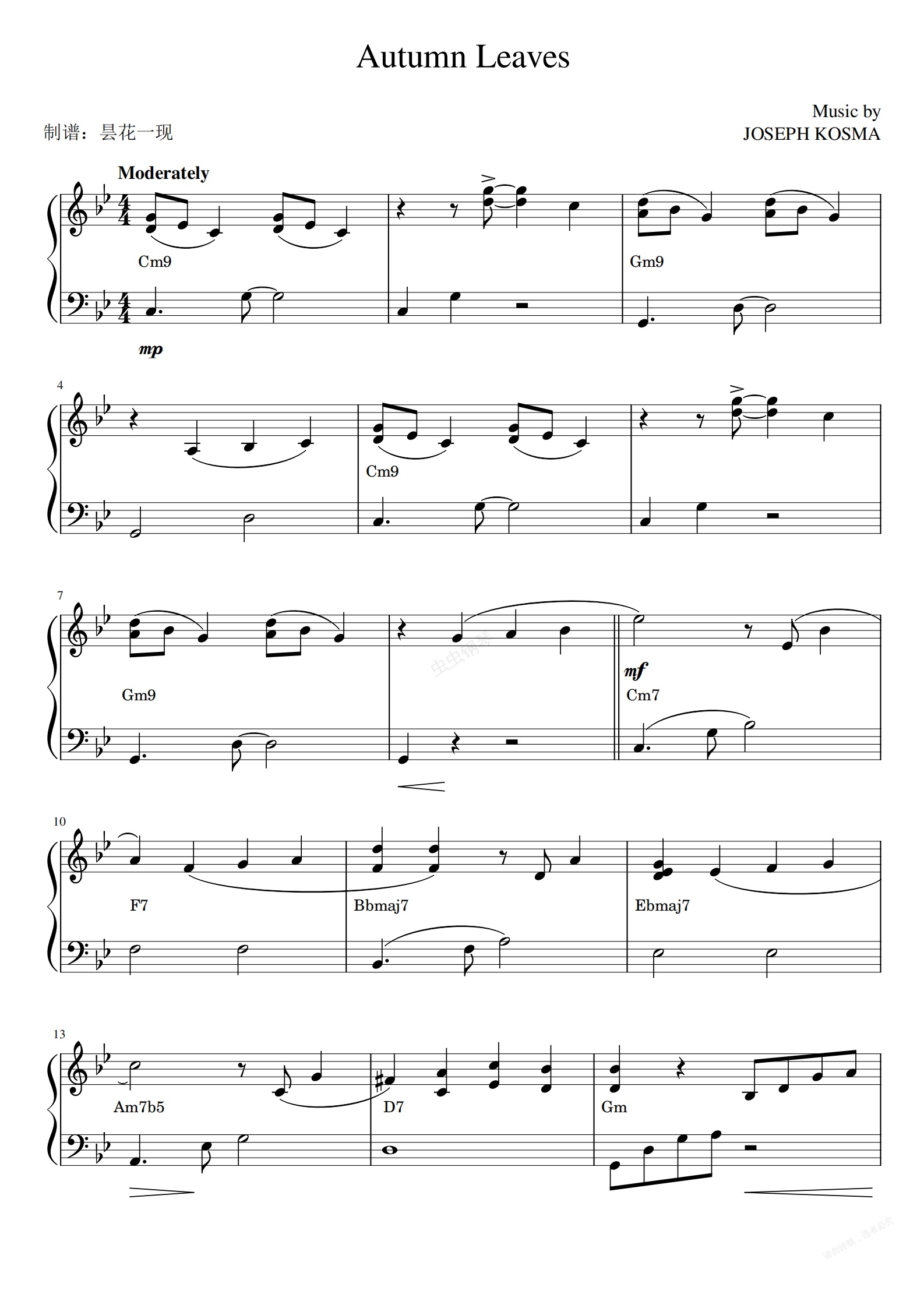 钢琴谱:秋叶(Autumn Leaves)