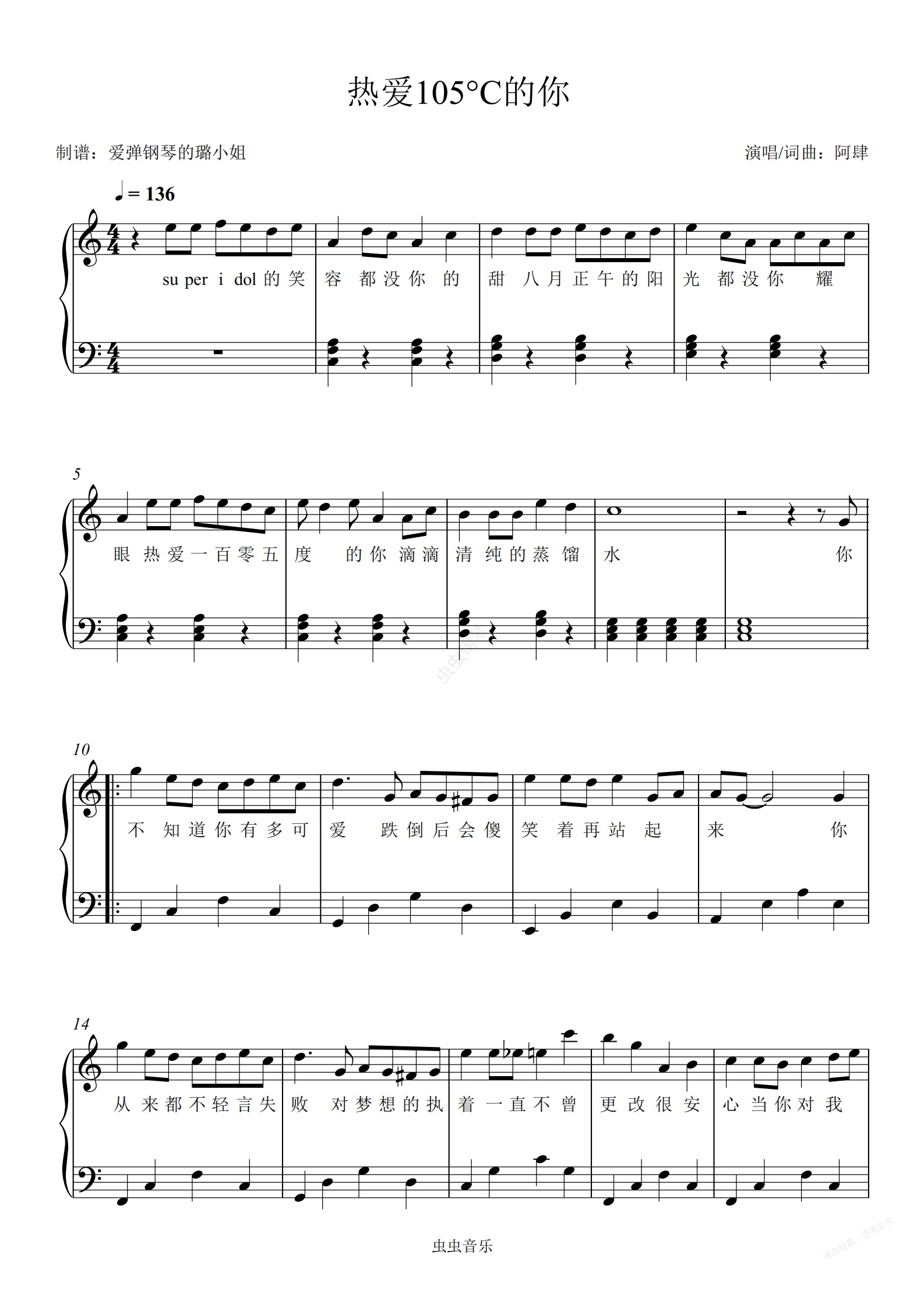 钢琴谱:热爱105°C的你 - 抖音热歌 - C调简单版 - 附带歌词