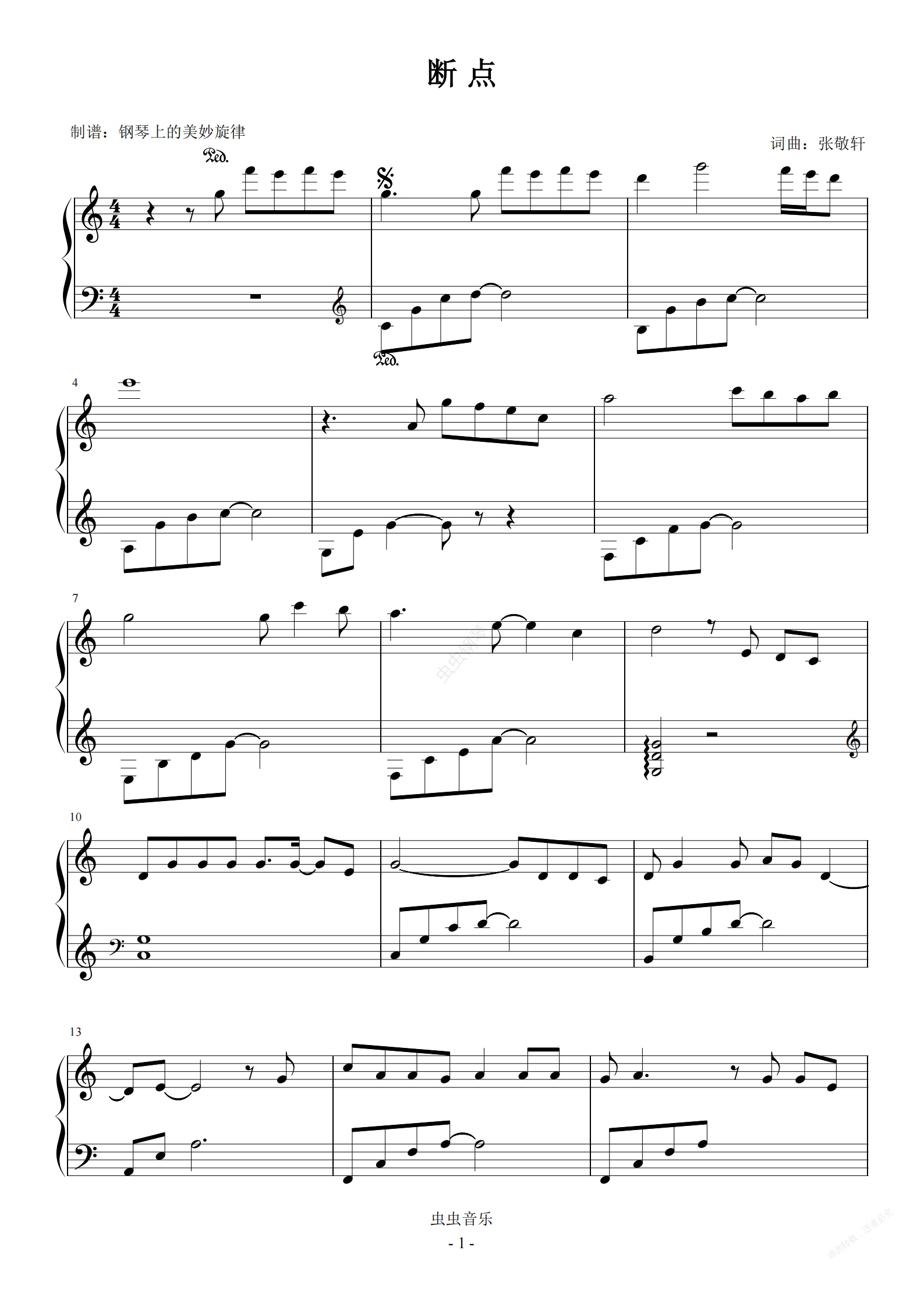 钢琴谱:断点 C调简易版 流行经典 张敬轩