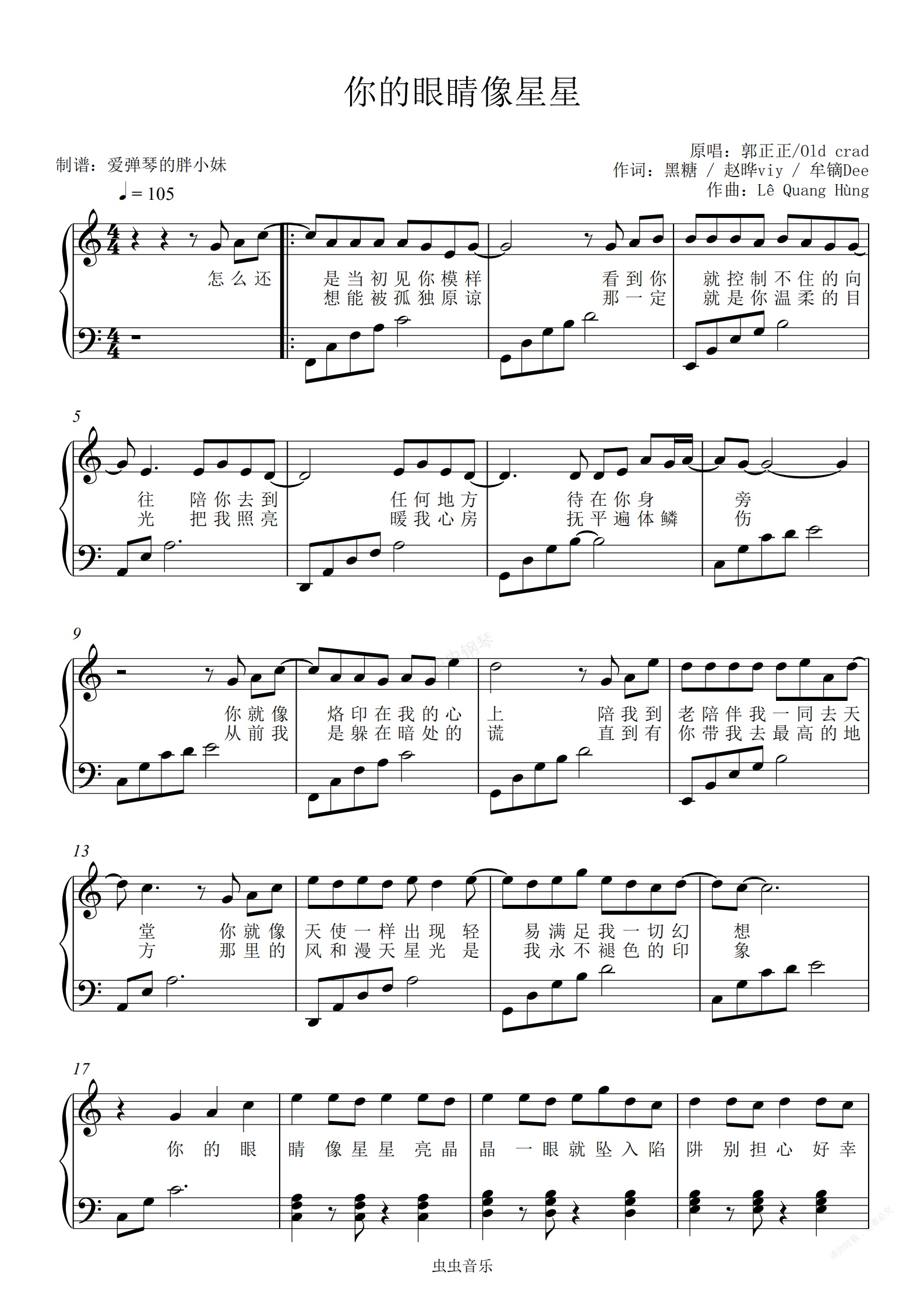 钢琴谱:你的眼睛像星星-C调初学者完整版(配歌词哦)
